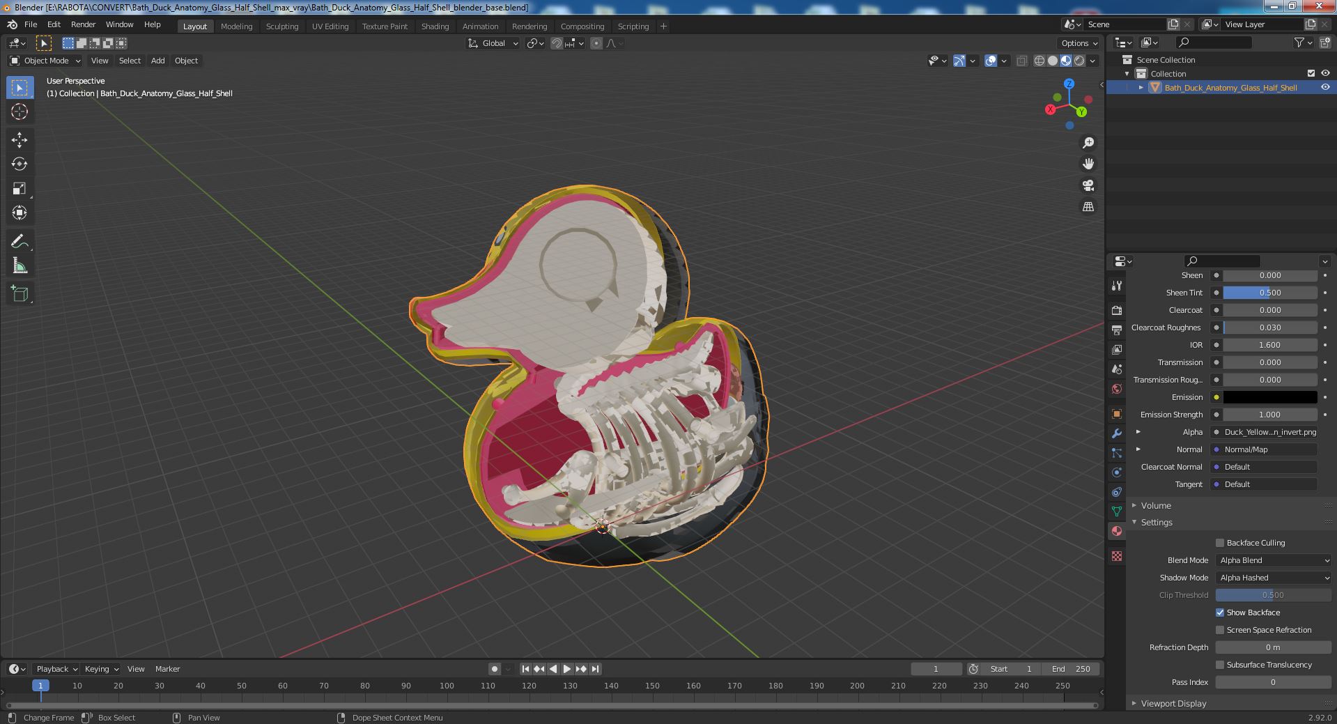 Bath Duck Anatomy Glass Half Shell is a high quality, photo real 3d model that will enhance detail and realism to any of your rendering projects. The model has a fully textured, detailed design that allows for close-up renders, and was originally modeled in 3ds Max 2020 and rendered with V-Ray. Renders have no postprocessing!