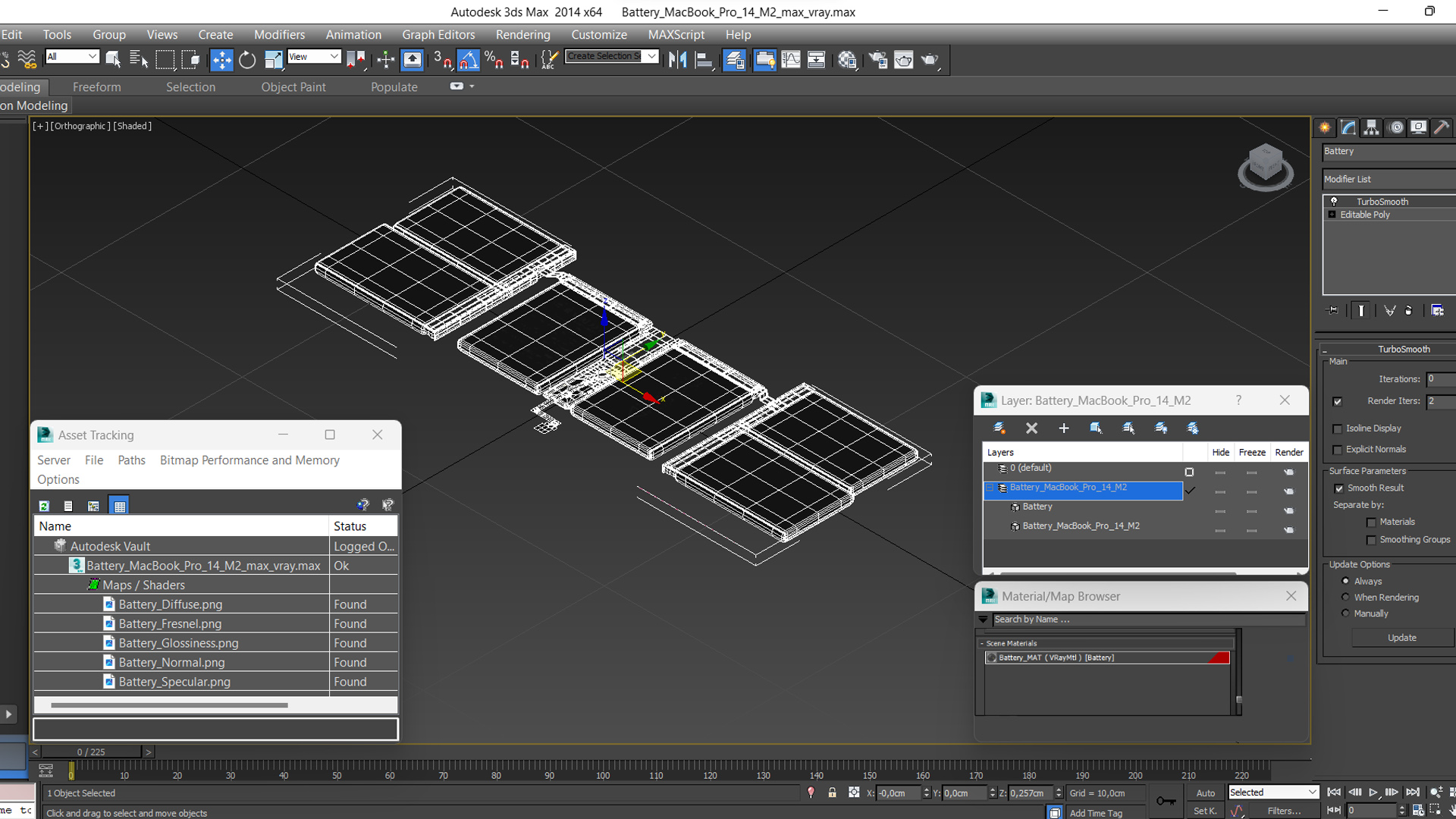 Battery MacBook Pro 14 M2 is a high quality, photo real 3d model that will enhance detail and realism to any of your rendering projects. The model has a fully textured, detailed design that allows for close-up renders, and was originally modeled in 3ds Max 2020 and rendered with V-Ray. Renders have no postprocessing!