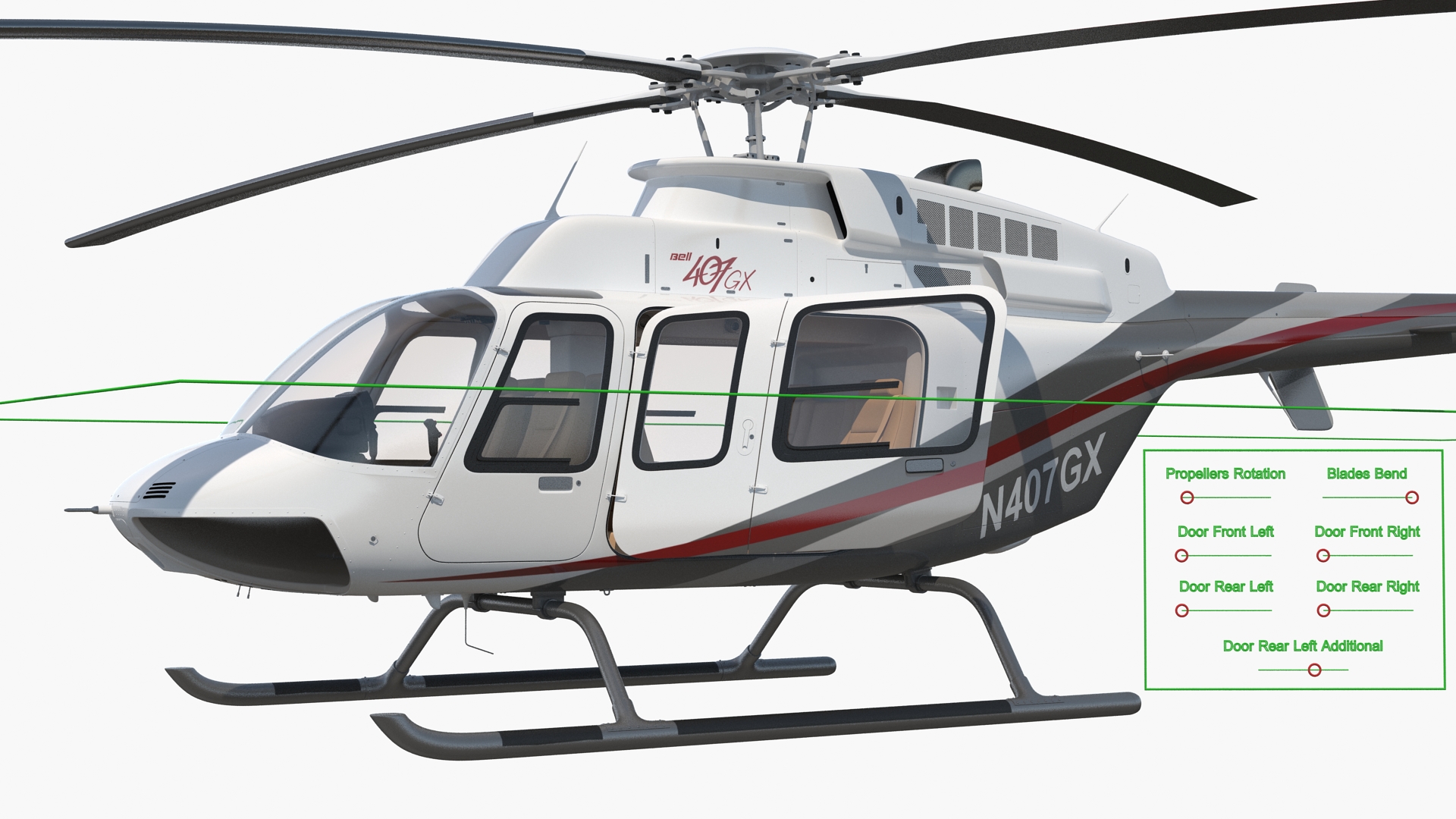 Bell 407 GX Utility Helicopter Rigged is fully rigged and is ready to be animated. You can easily position it the way you need or animate it the way your project requires using helpers in 3D Studio Max. See the turntable to get an idea of how rigging works.
