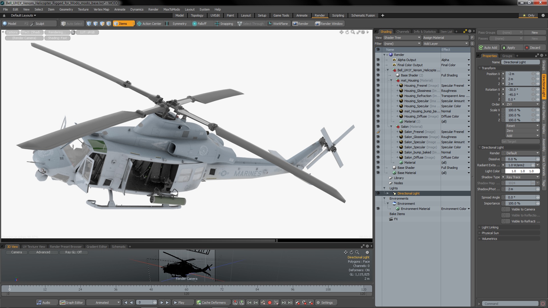 Bell UH1Y Venom Helicopter Rigged for Modo is a high quality, photo real 3d model that will enhance detail and realism to any of your rendering projects. The model has a fully textured, detailed design that allows for close-up renders, and was originally modeled in 3ds Max 2020 and rendered with V-Ray. Renders have no postprocessing!