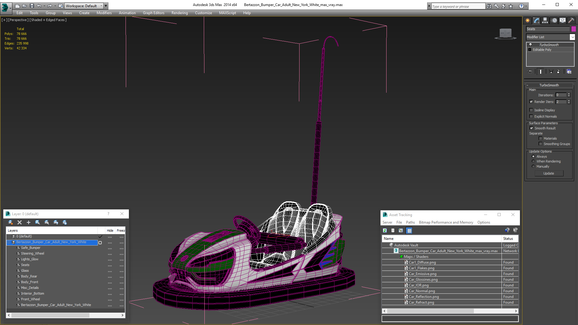 Bertazzon Bumper Car Adult New York White is a high quality, photo real 3d model that will enhance detail and realism to any of your rendering projects. The model has a fully textured, detailed design that allows for close-up renders, and was originally modeled in 3ds Max 2020 and rendered with V-Ray. Renders have no postprocessing!