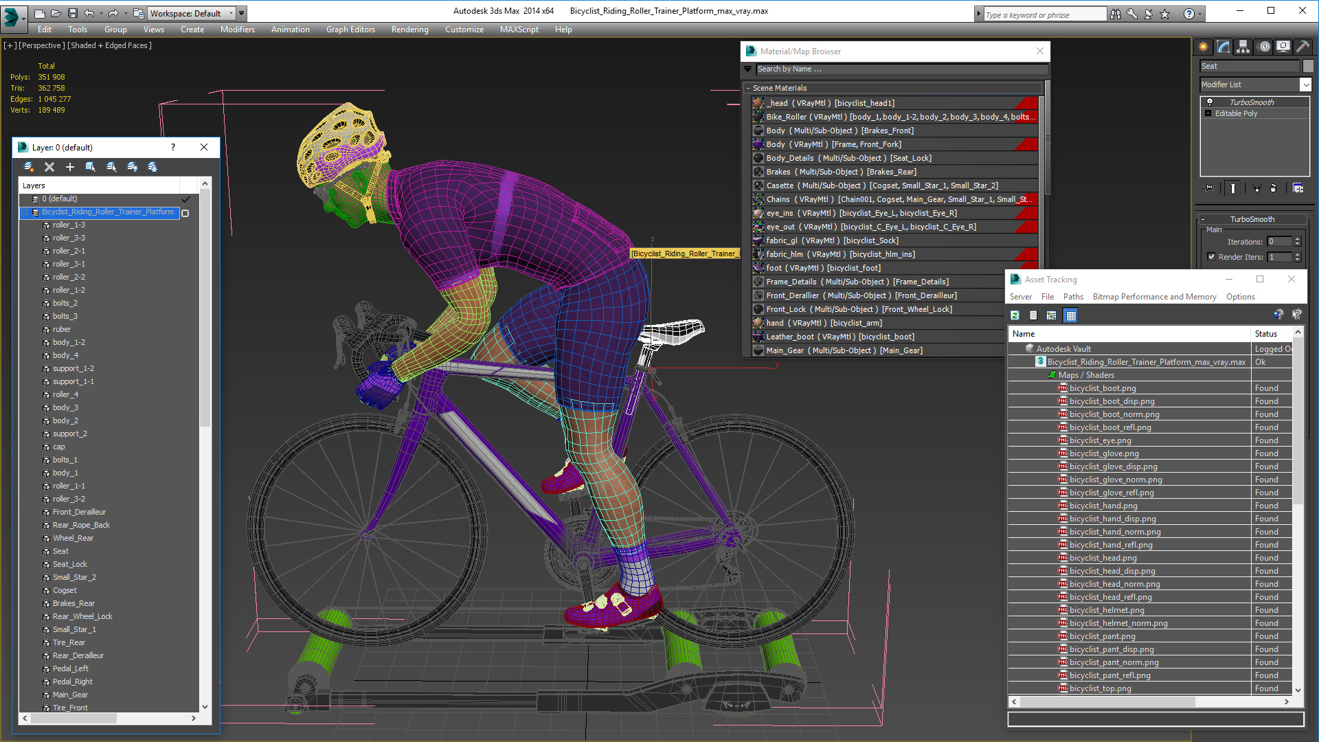 Bicyclist Riding Roller Trainer Platform is a high quality, photo real 3d model that will enhance detail and realism to any of your rendering projects. The model has a fully textured, detailed design that allows for close-up renders, and was originally modeled in 3ds Max 2020 and rendered with V-Ray. Renders have no postprocessing!