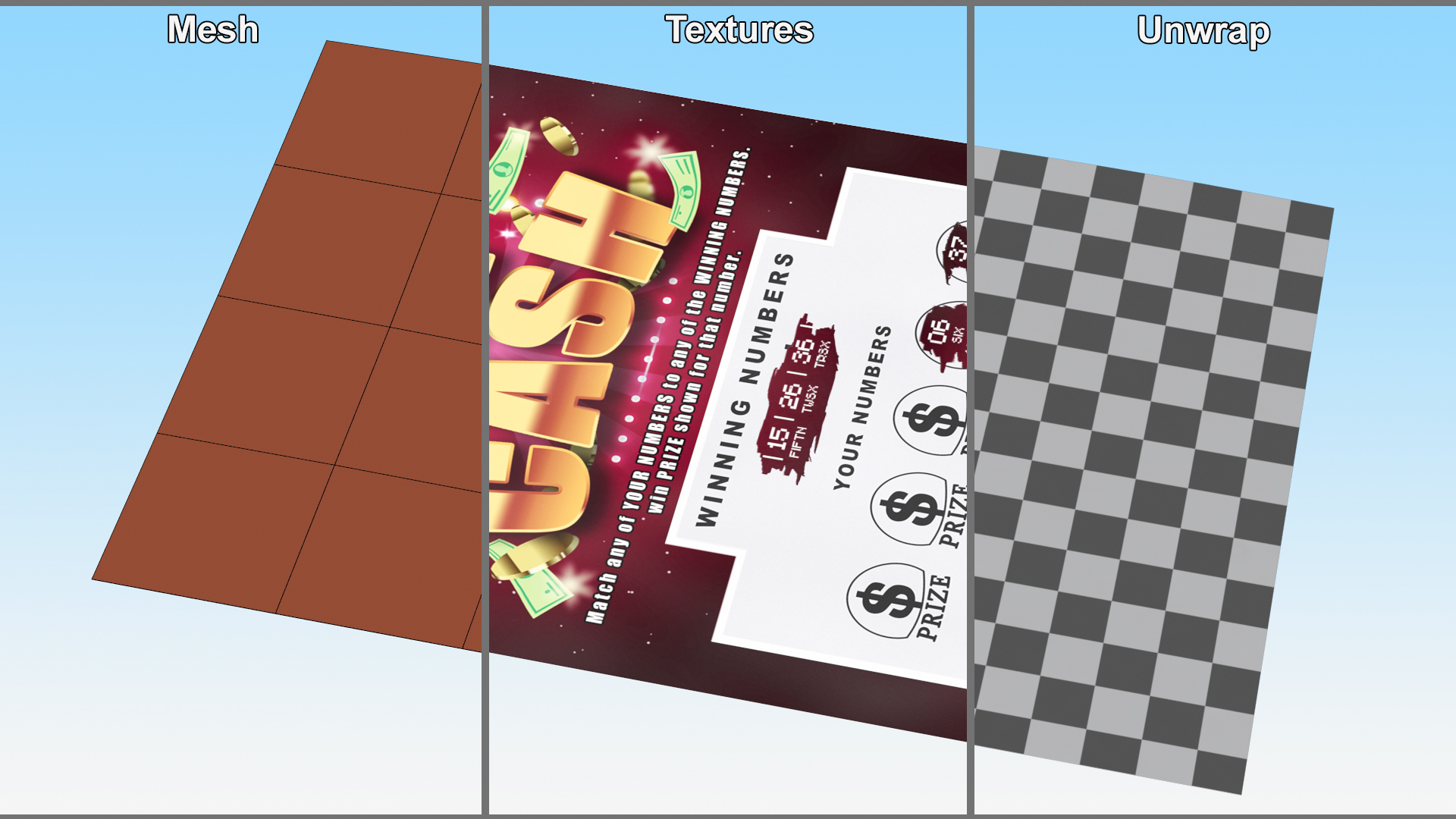 Big Cash Lottery Ticket with Erased Scratchcard is a high quality, photo real 3d model that will enhance detail and realism to any of your rendering projects. The model has a fully textured, detailed design that allows for close-up renders, and was originally modeled in 3ds Max 2020 and rendered with V-Ray. Renders have no postprocessing!