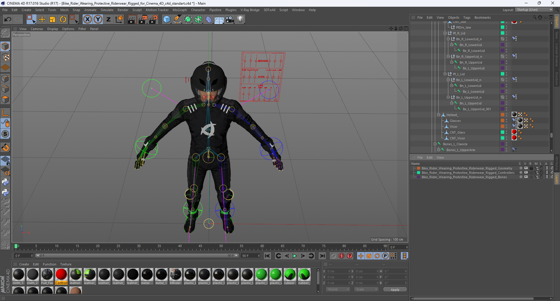 Bike Rider Wearing Protective Riderwear Rigged for Cinema 4D is fully rigged and is ready to be animated in Cinema 4D. You can easily position it the way you need or animate it the way your project requires. See the screenshots to get an idea of how rigging works. The pose of the model on the render images is an example and can be recreated using rig, it is not initially included into the product.