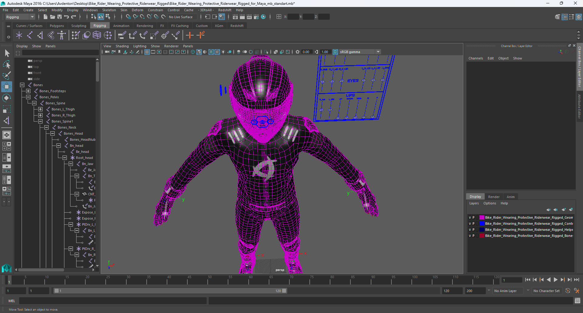 Bike Rider Wearing Protective Riderwear Rigged for Maya is fully rigged and is ready to be animated in Maya. You can easily position it the way you need or animate it the way your project requires. See the screenshots to get an idea of how rigging works. The pose of the model on the render images is an example and can be recreated using rig, it is not initially included into the product.