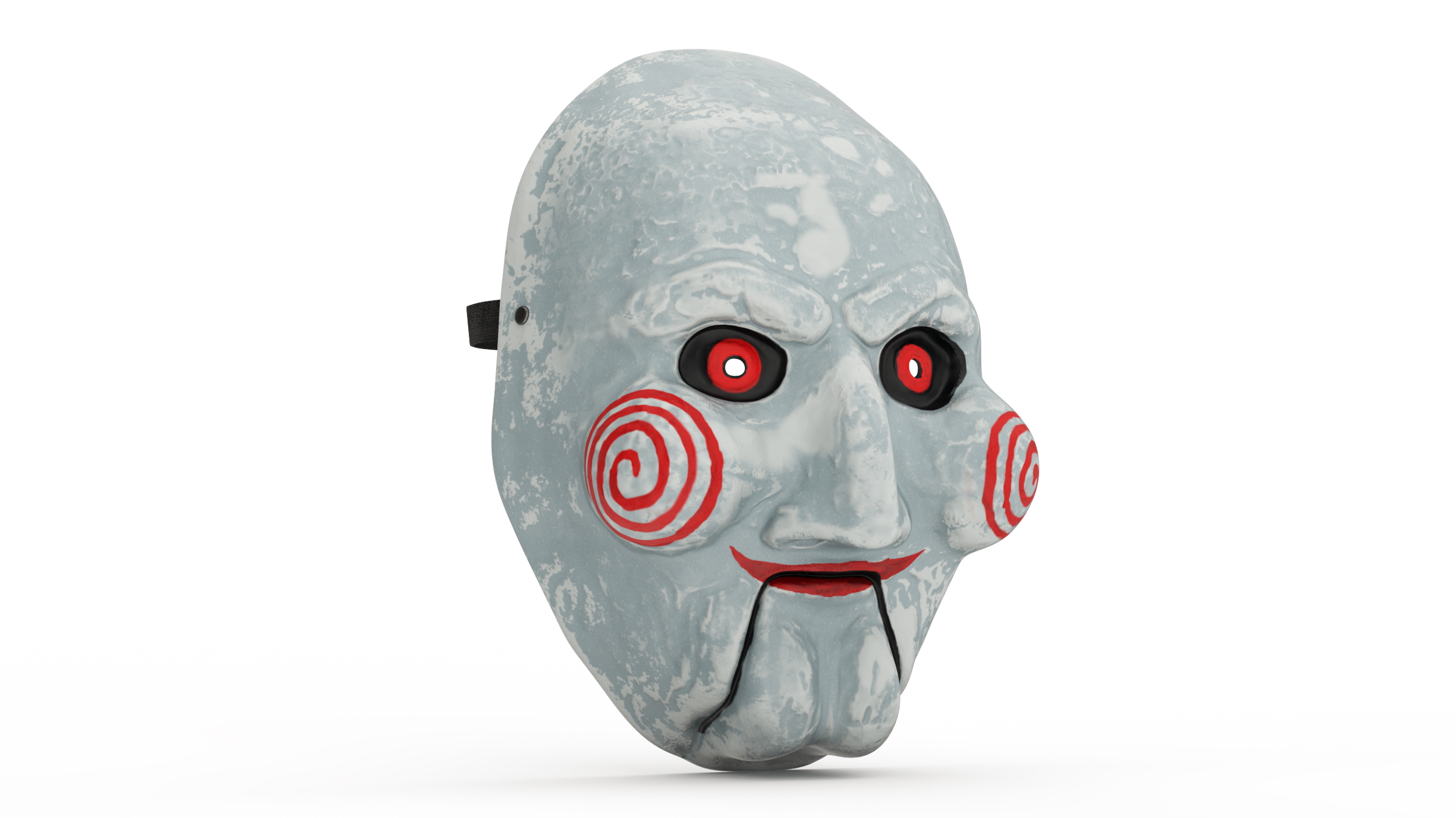 Billy Puppet Vacuform Mask Dressed on Head is a three-dimensional model of well known, popular mask which is the Saw franchise accessory (props).