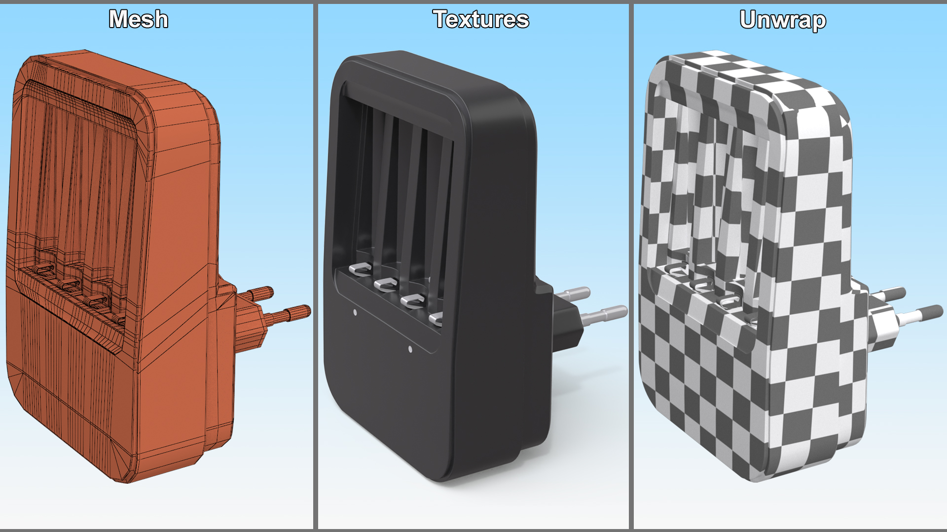 Black AA and AAA Battery Charger is a high quality, photo real 3d model that will enhance detail and realism to any of your rendering projects. The model has a fully textured, detailed design that allows for close-up renders, and was originally modeled in 3ds Max 2020 and rendered with V-Ray. Renders have no postprocessing!