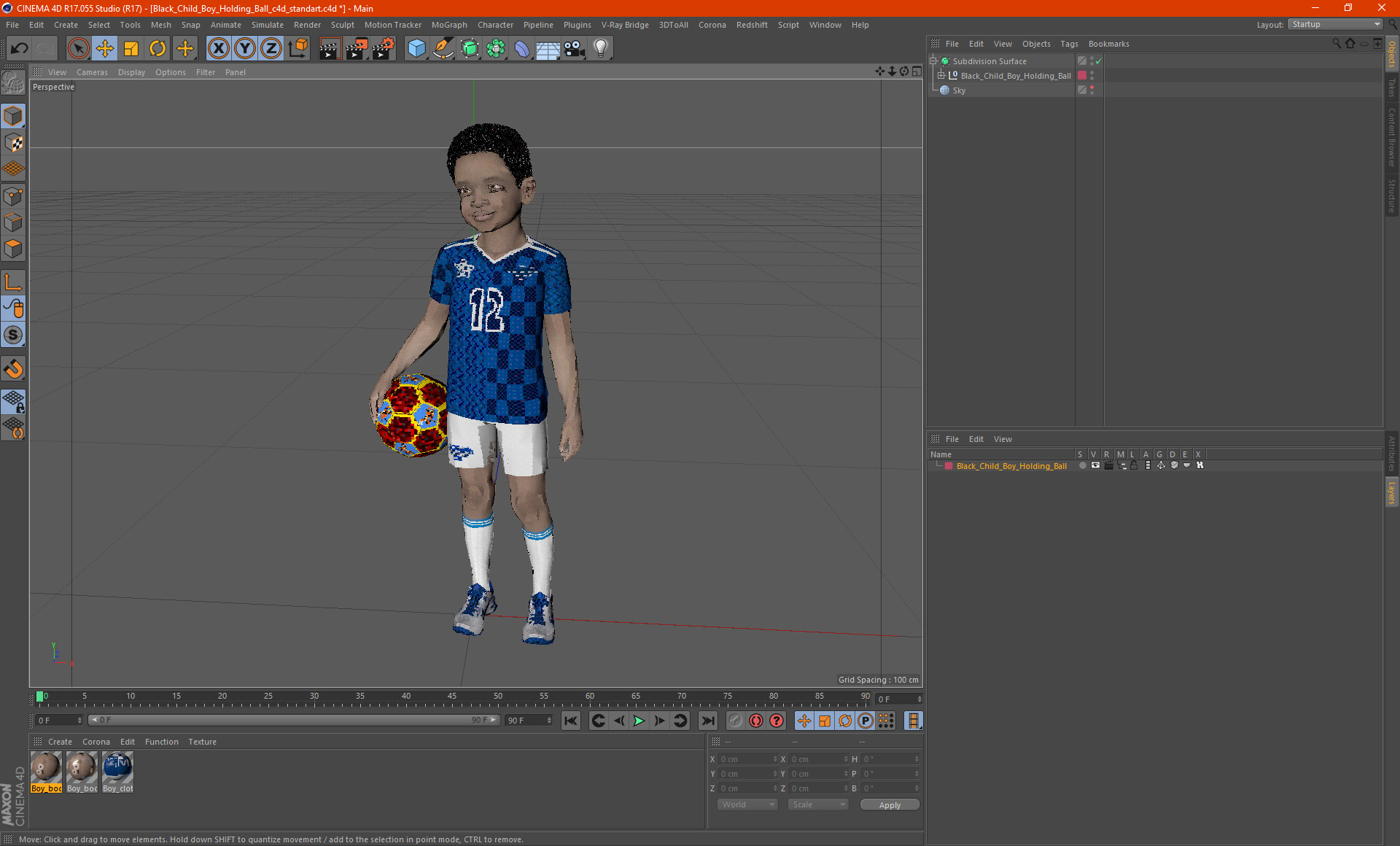 Black Child Boy Holding Ball is a high quality, photo real 3d model that will enhance detail and realism to any of your rendering projects. The model has a fully textured, detailed design that allows for close-up renders, and was originally modeled in 3ds Max 2020 and rendered with V-Ray. Renders have no postprocessing!