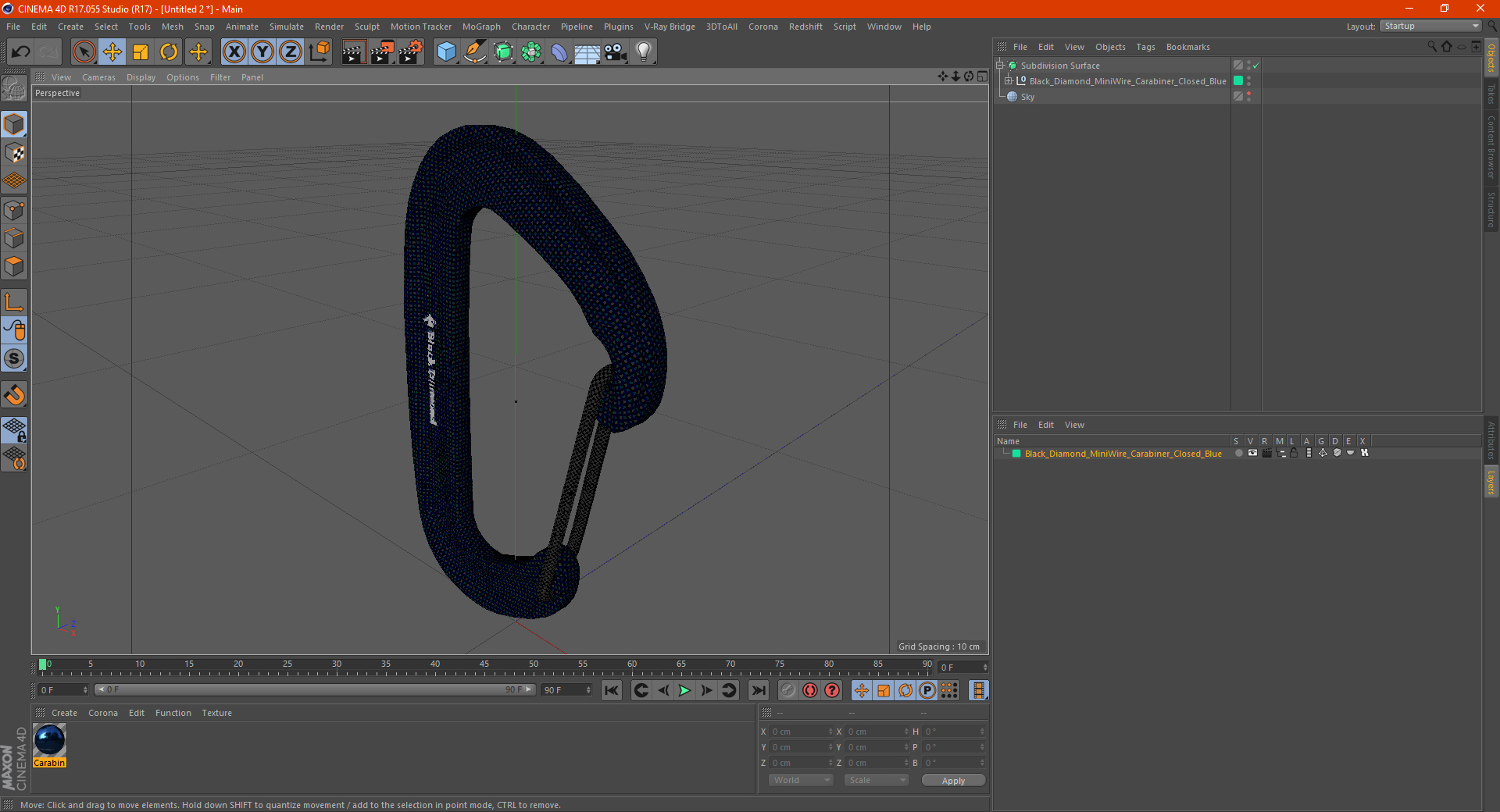 Black Diamond MiniWire Carabiner Closed Blue is a high quality, photo real 3d model that will enhance detail and realism to any of your rendering projects. The model has a fully textured, detailed design that allows for close-up renders, and was originally modeled in 3ds Max 2020 and rendered with V-Ray. Renders have no postprocessing!