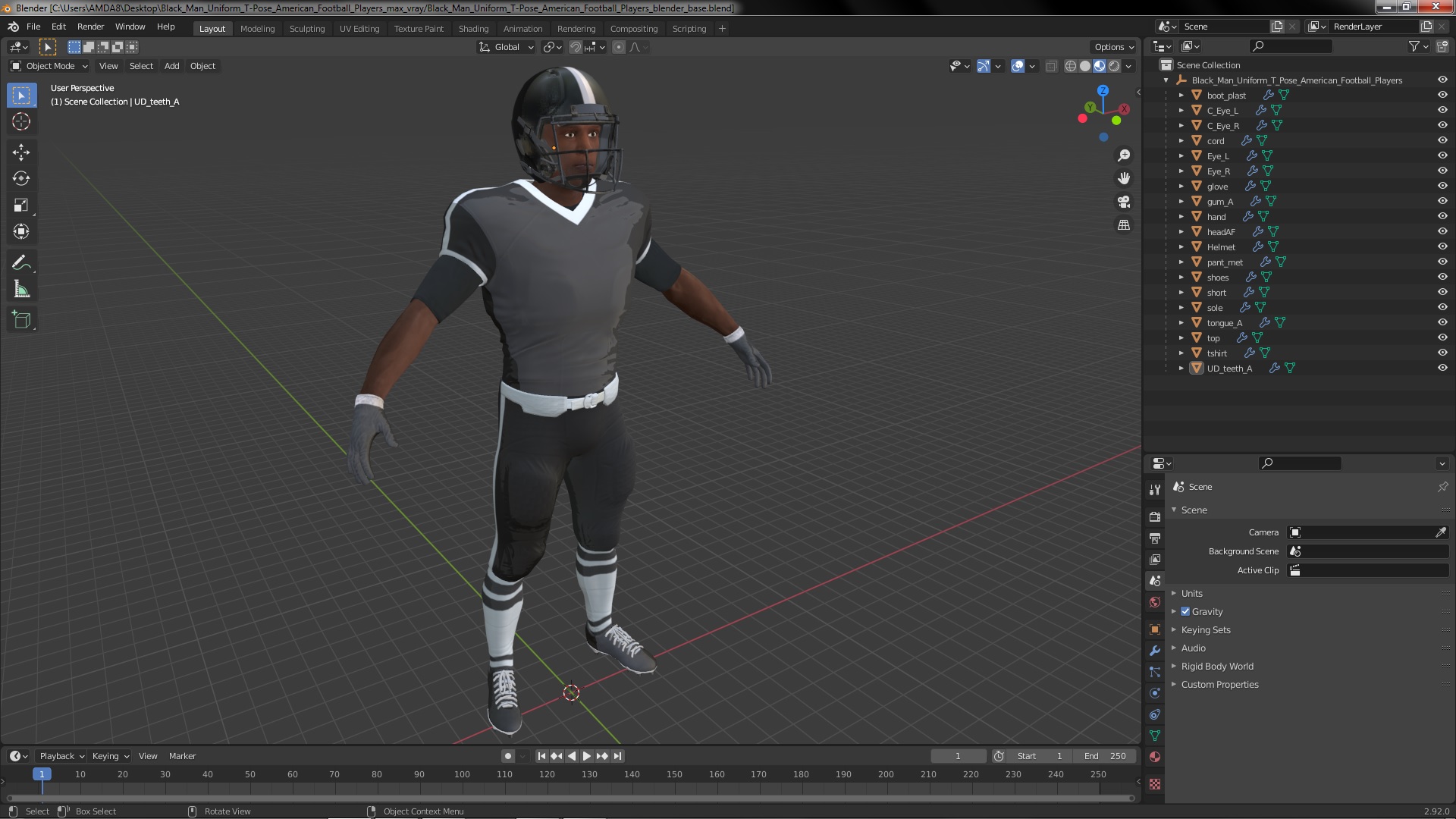Black Man Uniform T-Pose American Football Players is a high quality, photo real 3d model that will enhance detail and realism to any of your rendering projects. The model has a fully textured, detailed design that allows for close-up renders, and was originally modeled in 3ds Max 2020 and rendered with V-Ray. Renders have no postprocessing!