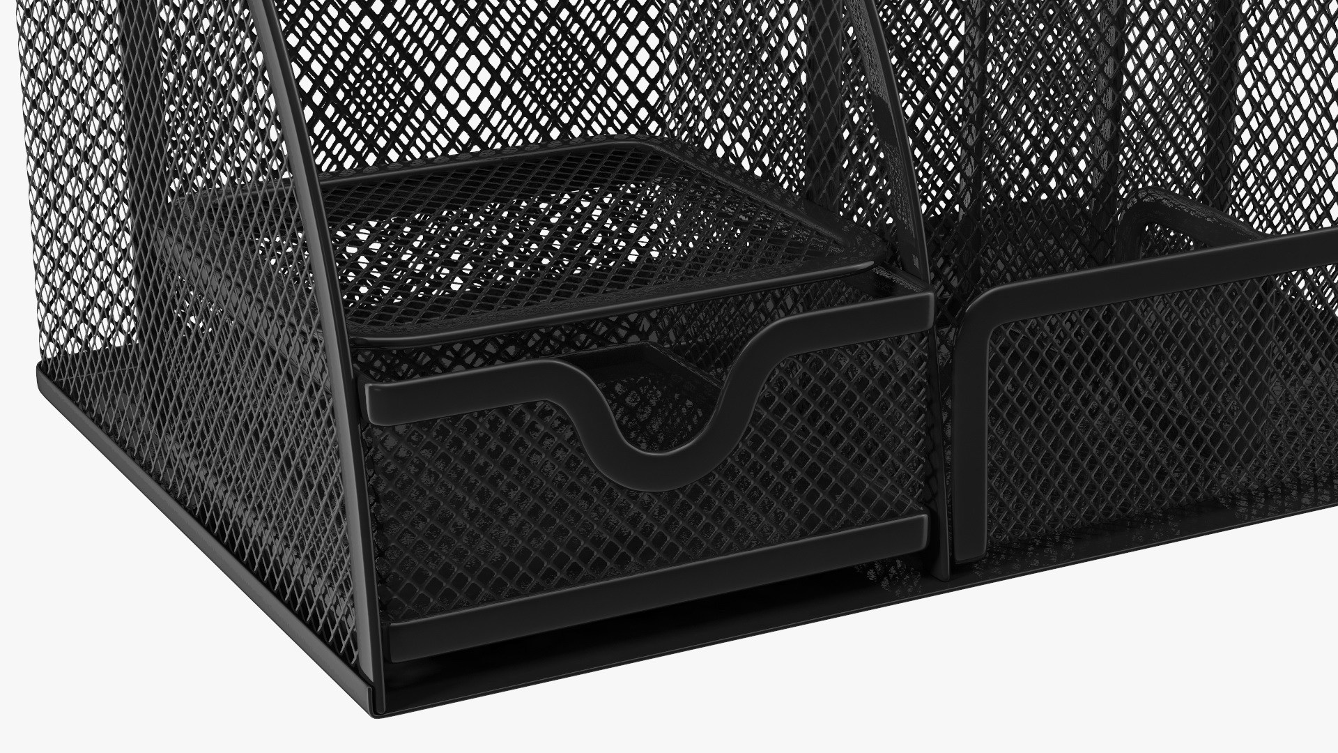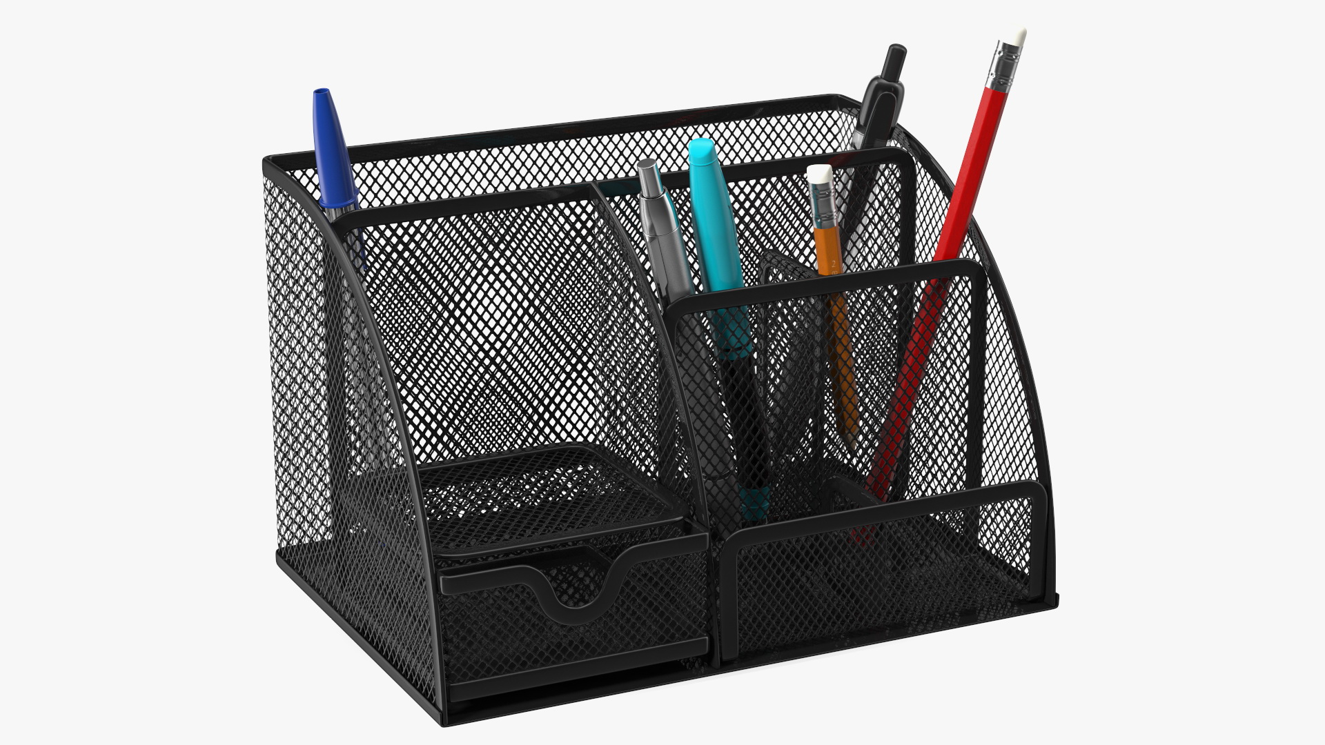 Mesh stationery container designed for storing of pens, pencils, paints, markers, paperclips, correction tapes, erasers, small paper notes, binder clips, staples, paper clips and more.