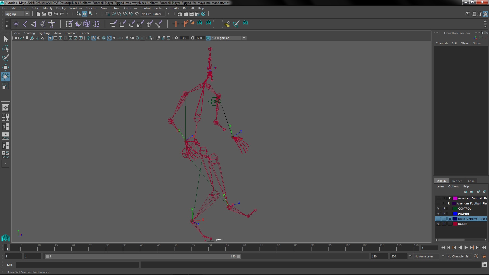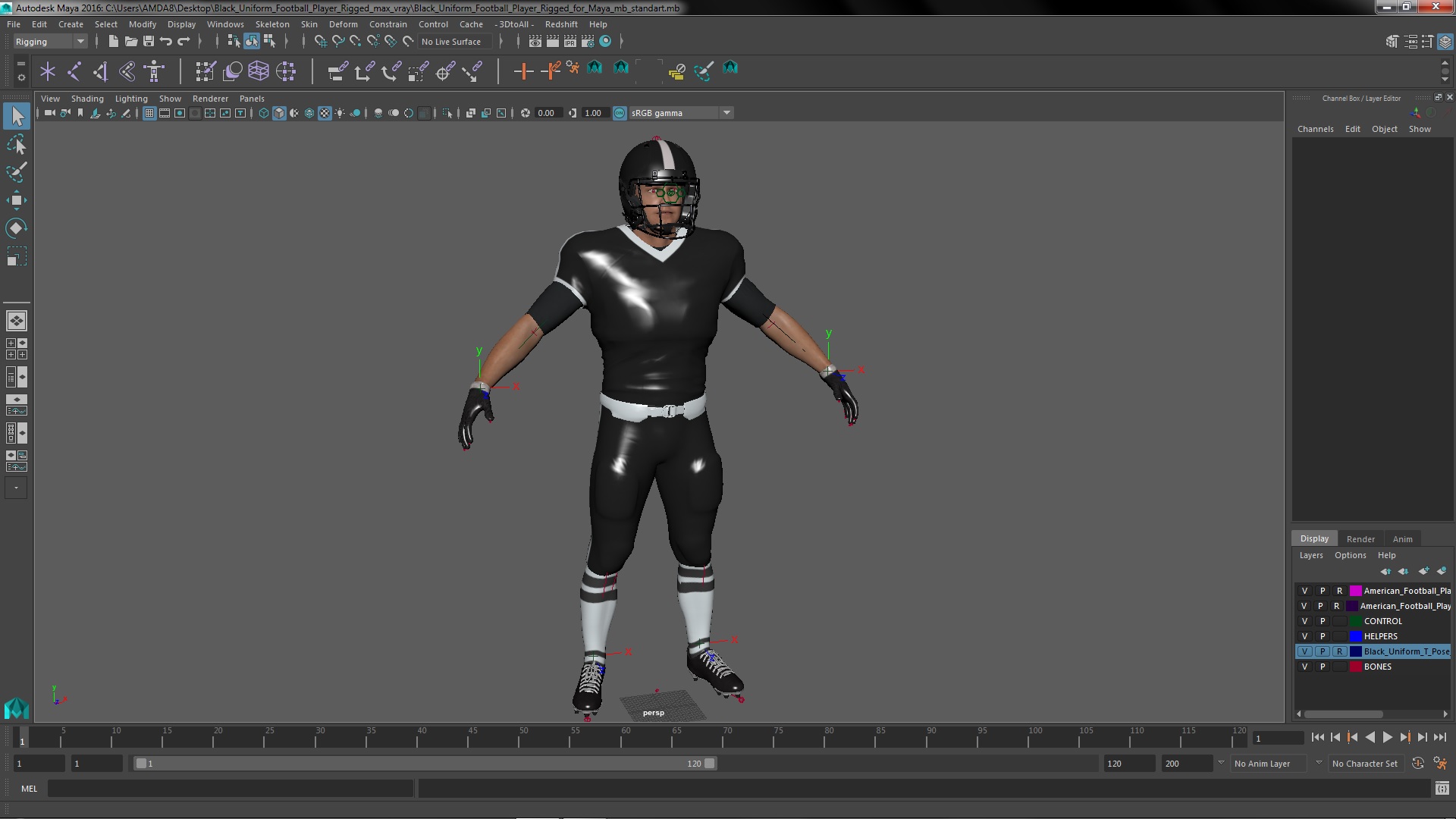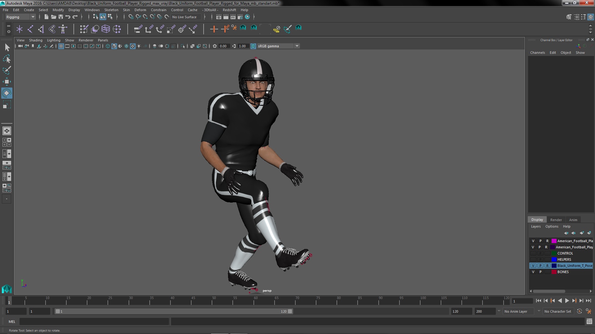 Black Uniform Football Player Rigged for Maya is fully rigged and is ready to be animated in Maya. You can easily position it the way you need or animate it the way your project requires. See the screenshots to get an idea of how rigging works. The pose of the model on the render images is an example and can be recreated using rig, it is not initially included into the product.