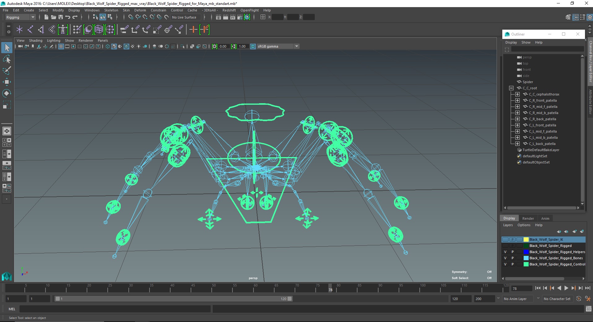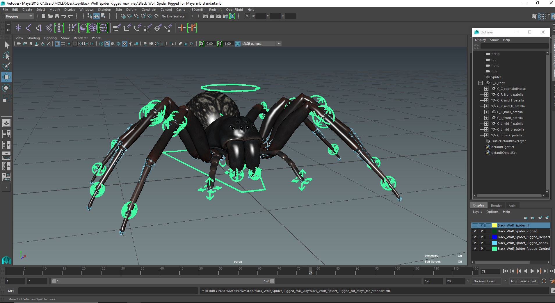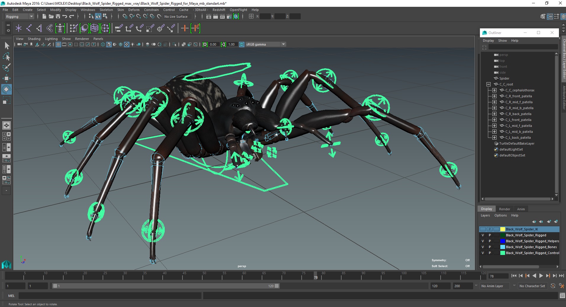 Black Wolf Spider Rigged for Maya is fully rigged and is ready to be animated in Maya. You can easily position it the way you need or animate it the way your project requires. See the screenshots to get an idea of how rigging works. The pose of the model on the render images is an example and can be recreated using rig, it is not initially included into the product.