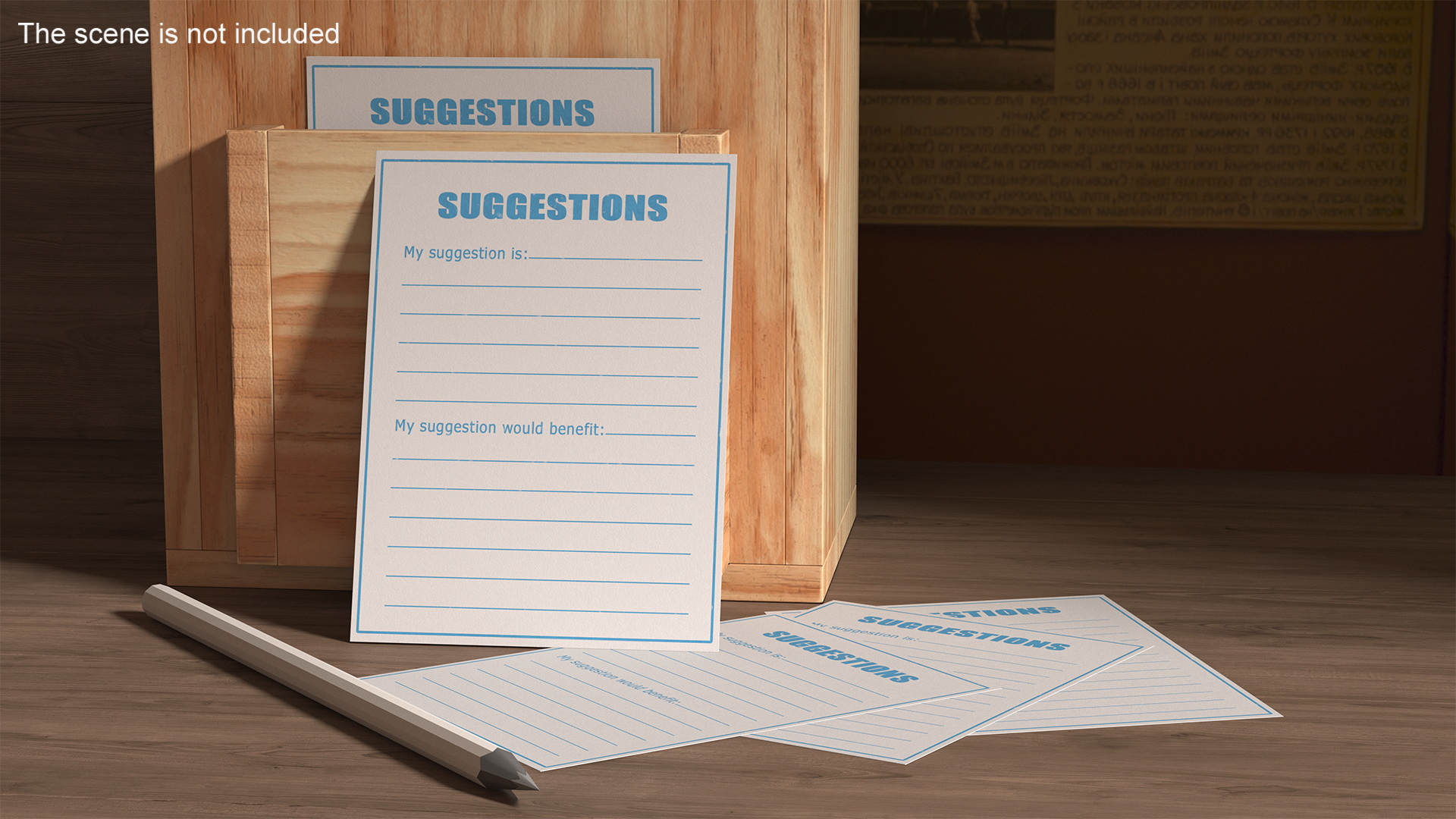 Blank Suggestions Form Light Blue is a high quality, photo real 3d model that will enhance detail and realism to any of your rendering projects. The model has a fully textured, detailed design that allows for close-up renders, and was originally modeled in 3ds Max 2020 and rendered with V-Ray. Renders have no postprocessing!