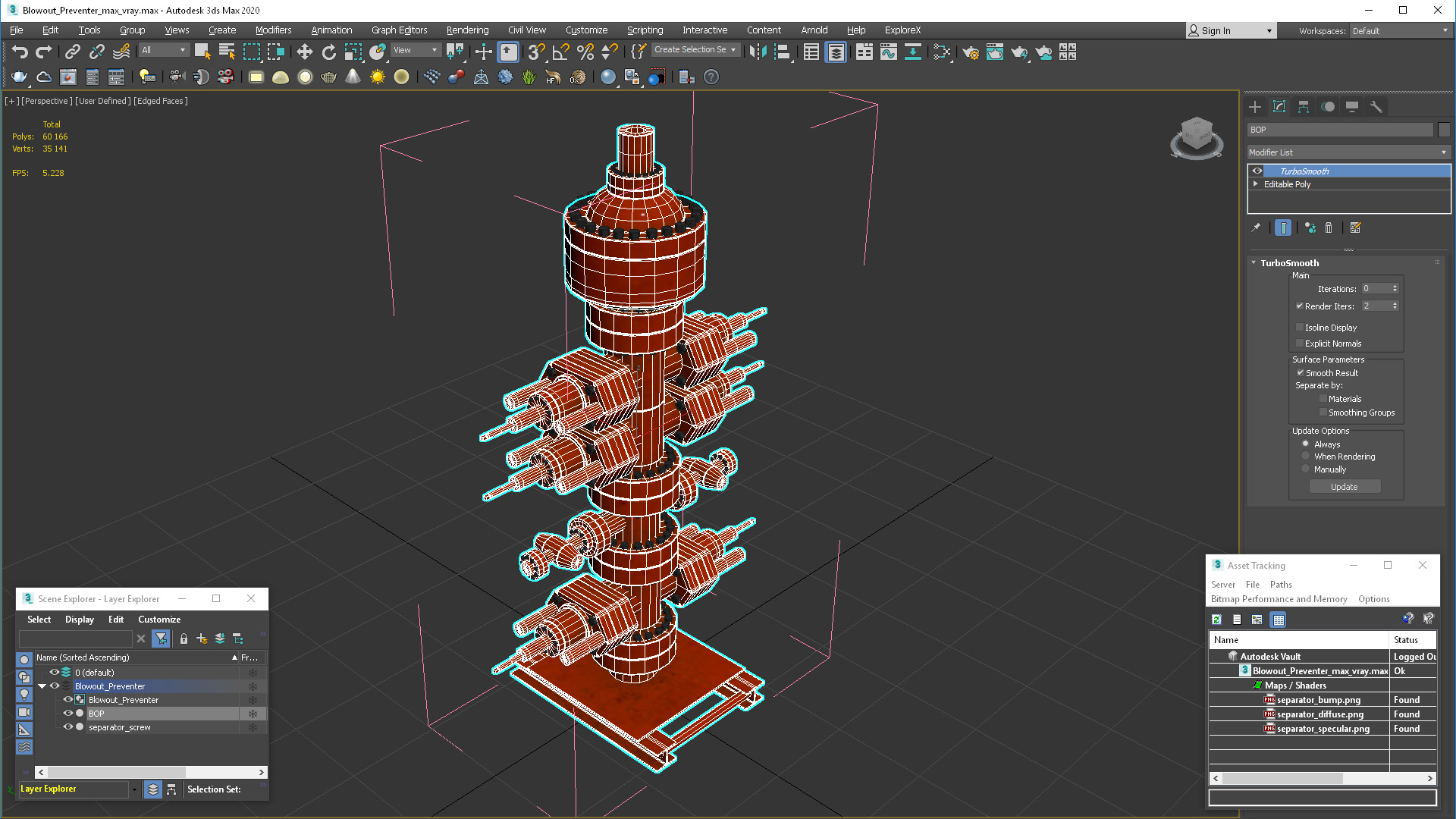 Blowout Preventer is a high quality, photo real 3d model that will enhance detail and realism to any of your rendering projects. The model has a fully textured, detailed design that allows for close-up renders, and was originally modeled in 3ds Max 2020 and rendered with V-Ray. Renders have no postprocessing!