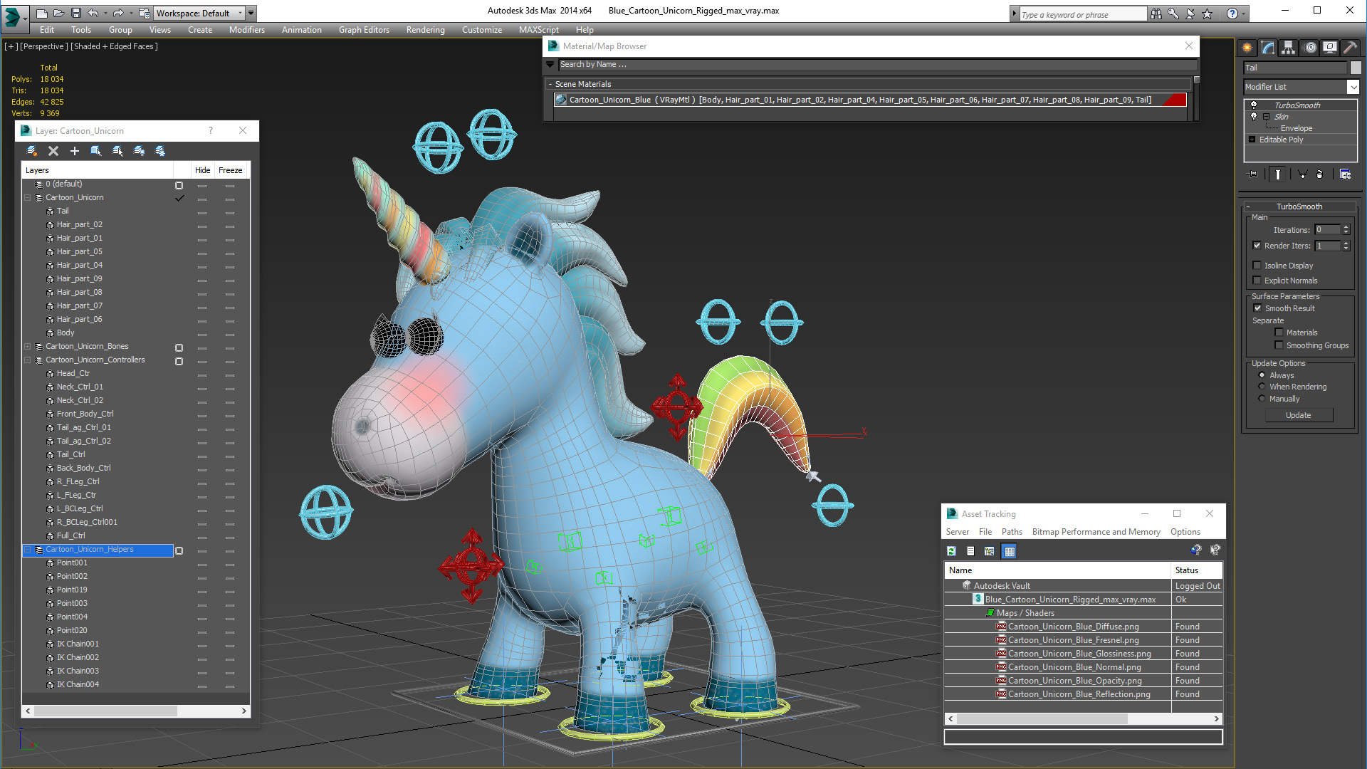 Blue Cartoon Unicorn Rigged is fully rigged and is ready to be animated. You can easily position it the way you need or animate it the way your project requires using helpers in 3D Studio Max. See the turntable to get an idea of how rigging works.