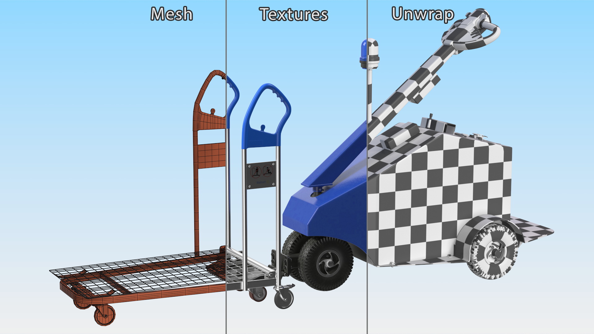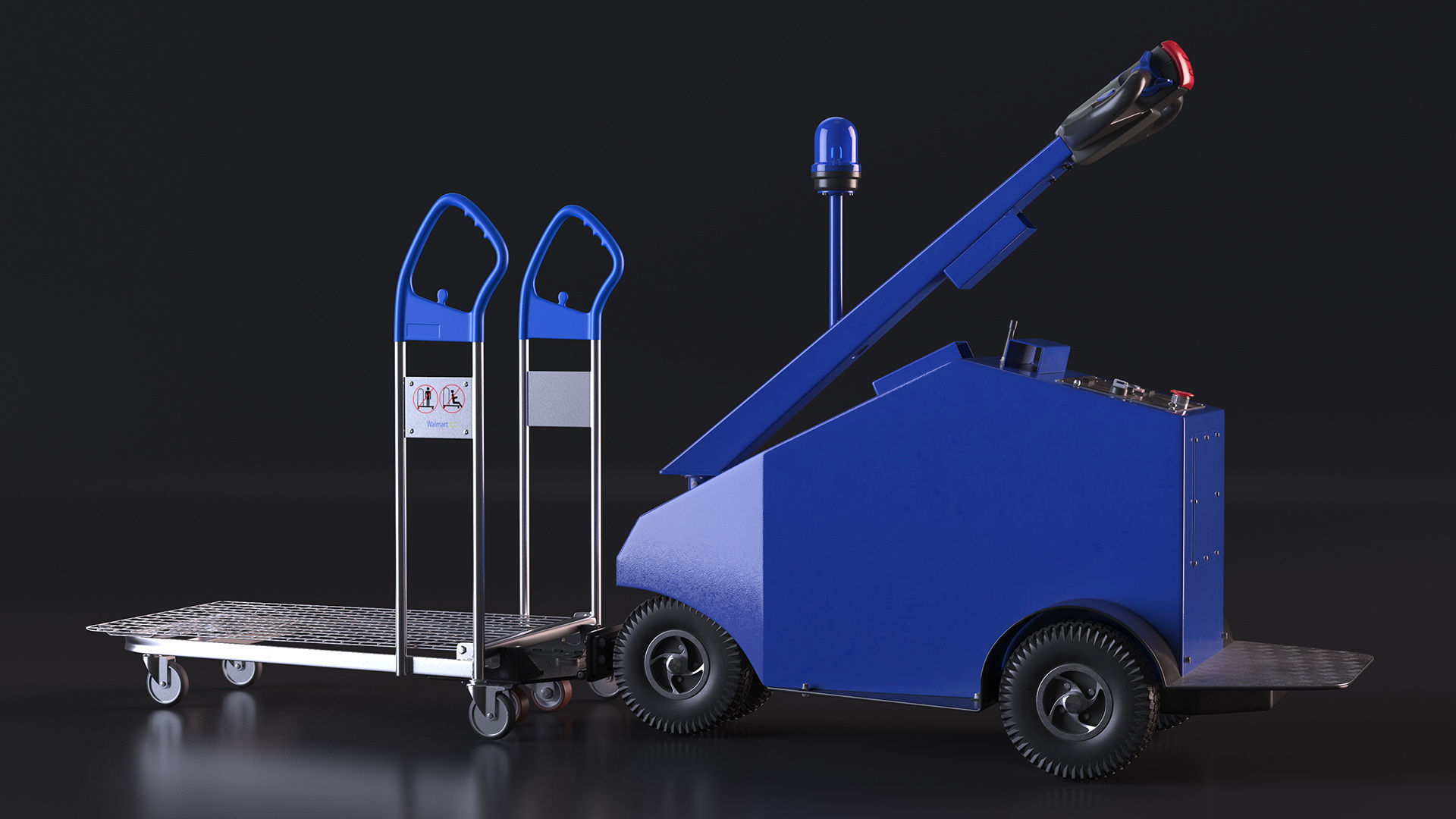 Blue Powered Tug Pusher with Cargo Trolley is a 3d model of device that is used to push or pull heavy loads on a cargo trolley in industries such as manufacturing, warehousing, and logistics.