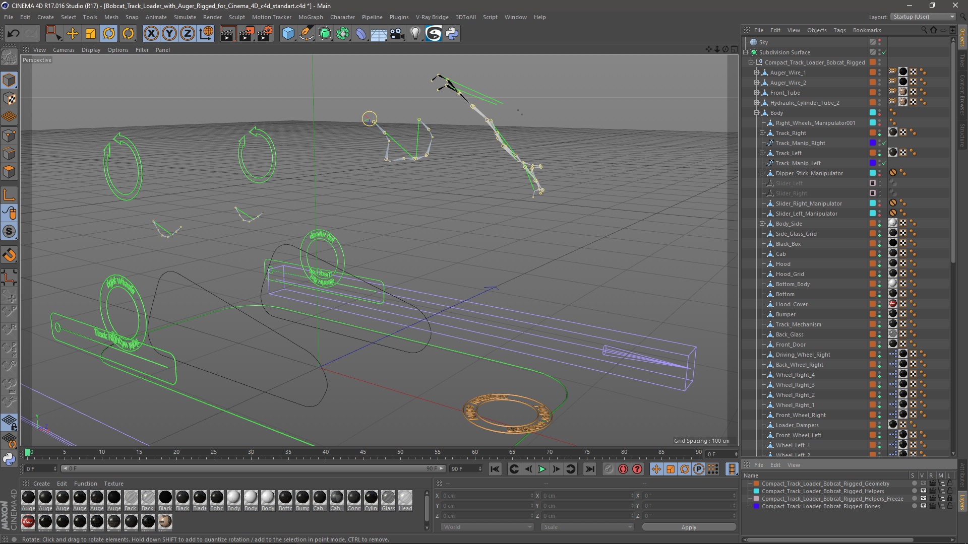 Bobcat Track Loader with Auger Rigged for Cinema 4D is fully rigged and is ready to be animated in Cinema 4D. You can easily position it the way you need or animate it the way your project requires. See the screenshots to get an idea of how rigging works. The pose of the model on the render images is an example and can be recreated using rig, it is not initially included into the product.
