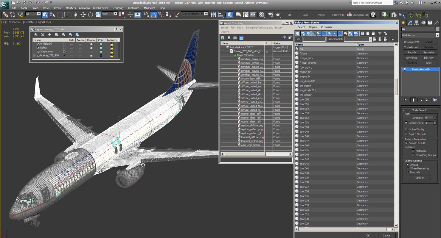 Boeing 737 900 with Interior and Cockpit United Airlines is a high quality, photo real 3d model that will enhance detail and realism to any of your rendering projects. The model has a fully textured, detailed design that allows for close-up renders, and was originally modeled in 3ds Max 2020 and rendered with V-Ray. Renders have no postprocessing!