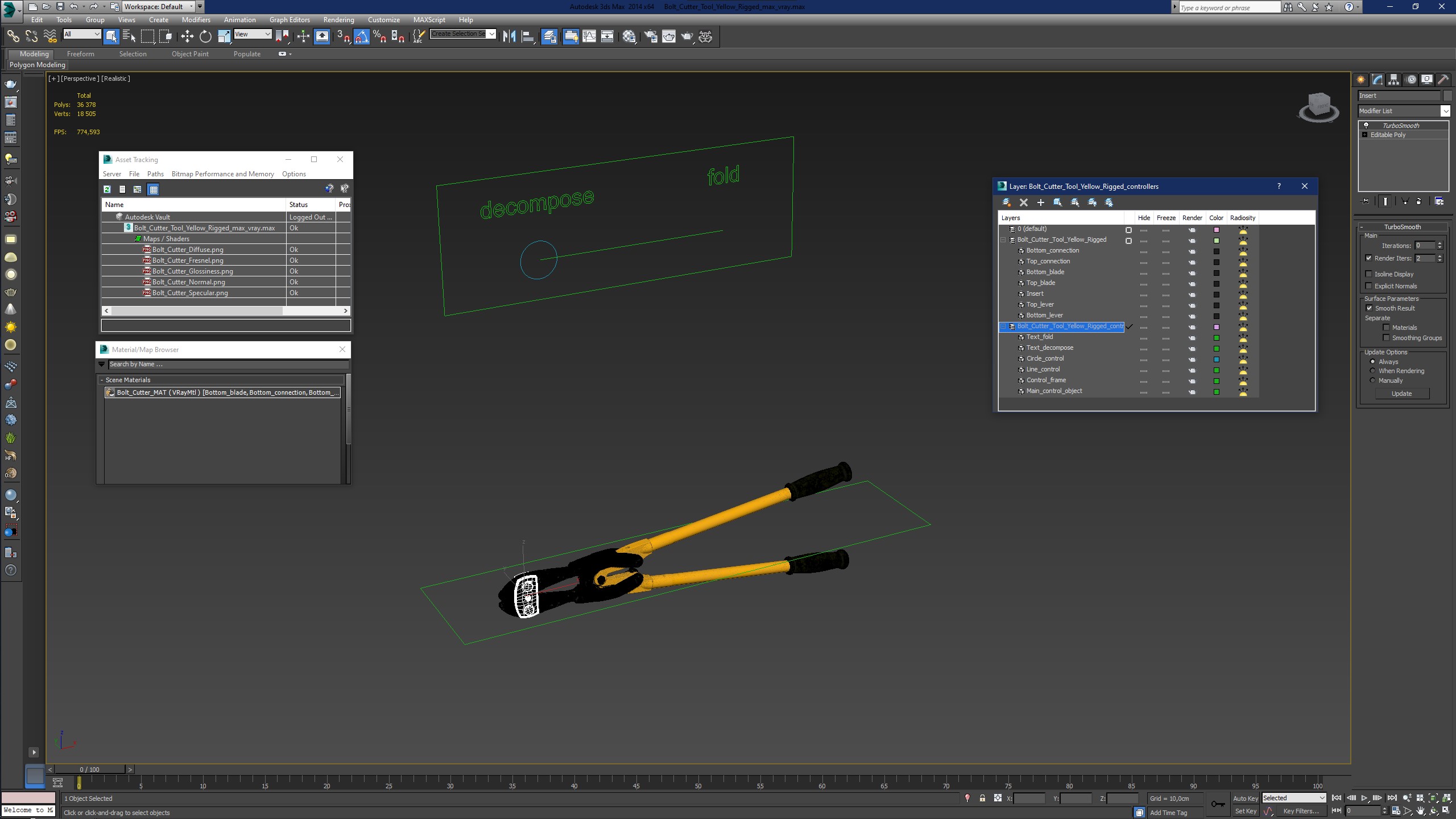 Bolt Cutter Tool Yellow Rigged is fully rigged and is ready to be animated. You can easily position it the way you need or animate it the way your project requires using helpers in 3D Studio Max. See the turntable to get an idea of how rigging works.