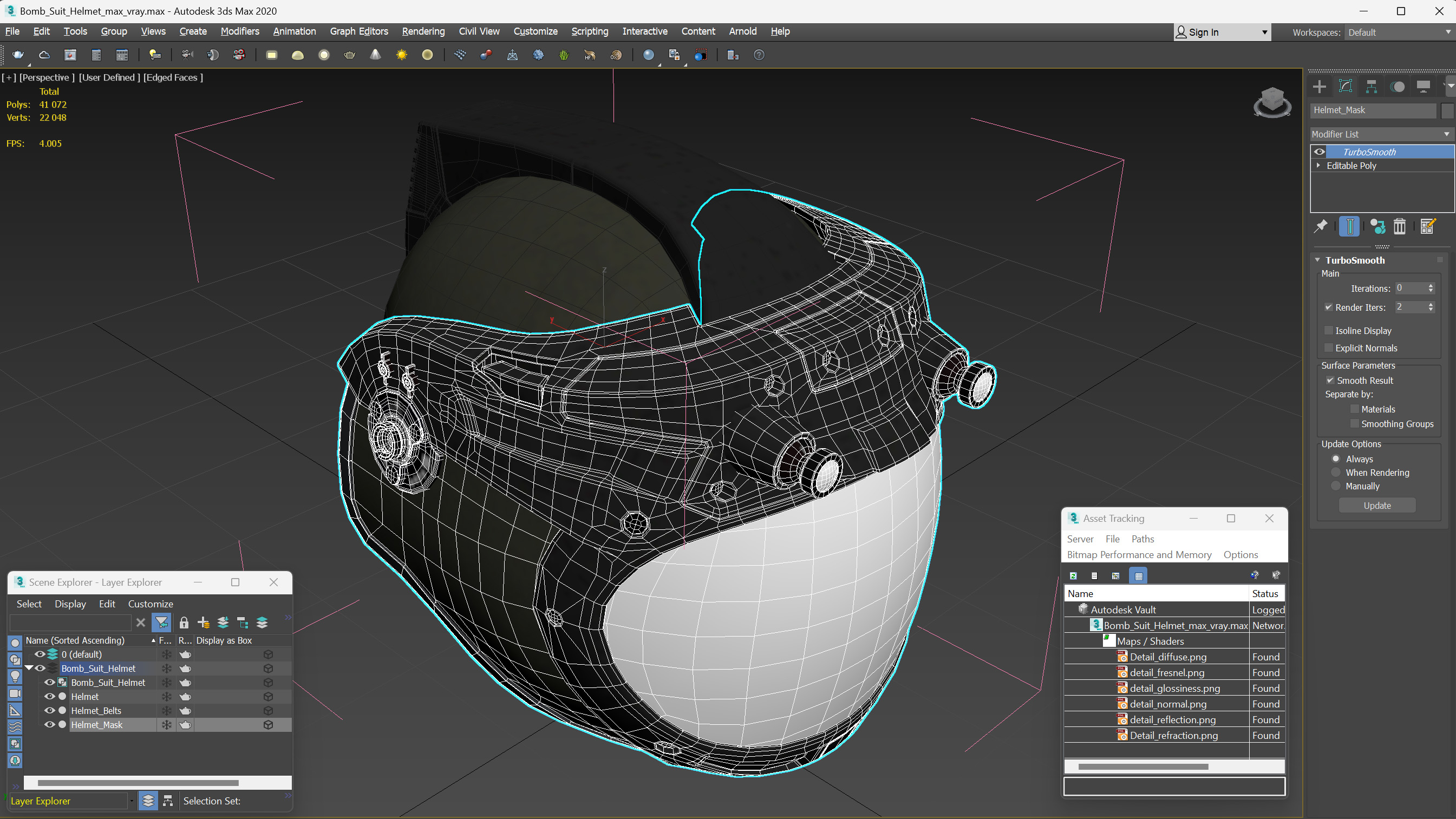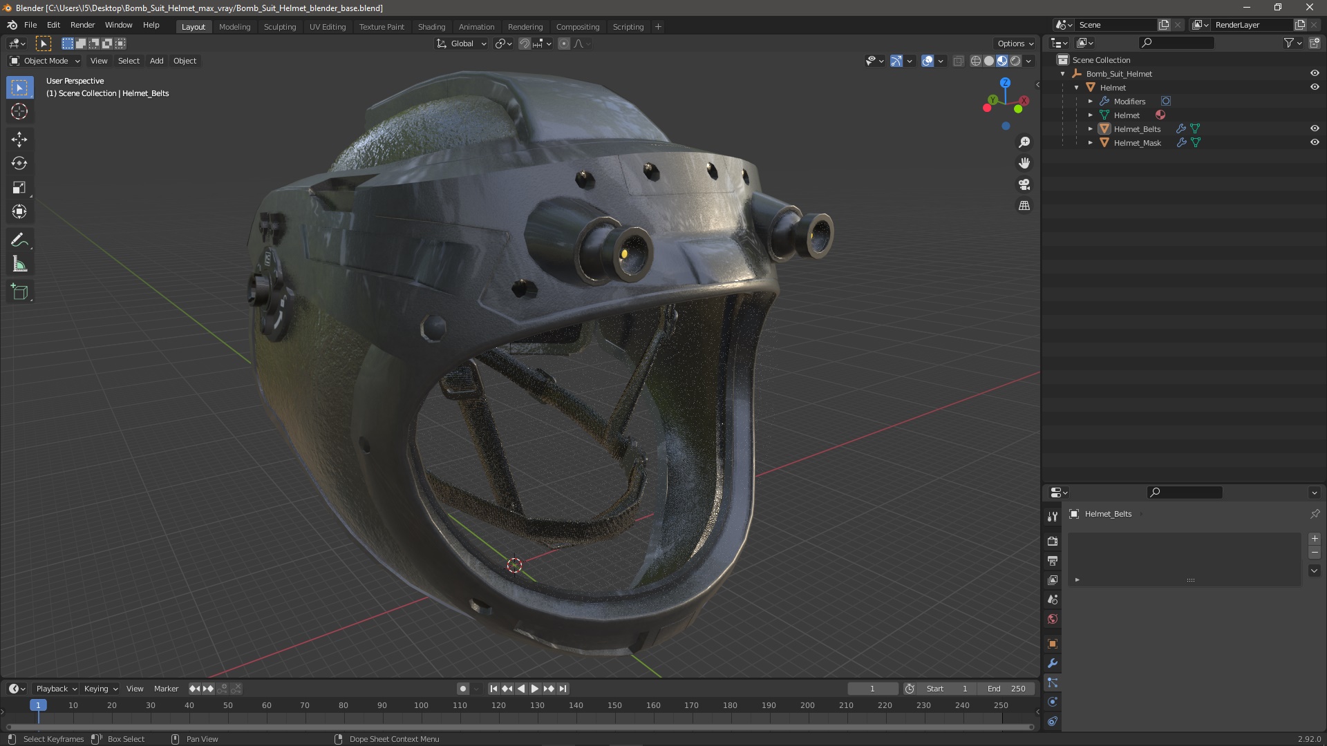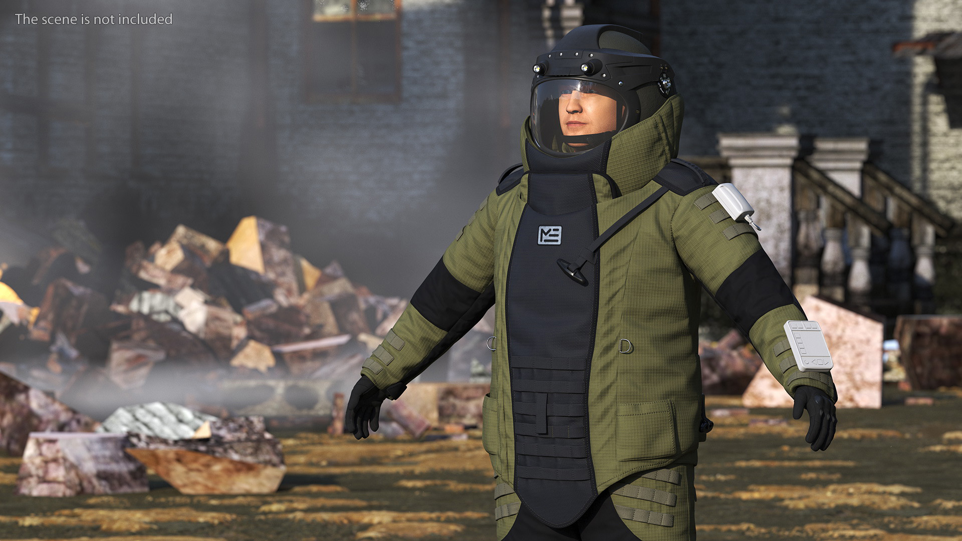 Bomb Suit Helmet is a high quality, photo real 3d model that will enhance detail and realism to any of your rendering projects. The model has a fully textured, detailed design that allows for close-up renders, and was originally modeled in 3ds Max 2020 and rendered with V-Ray. Renders have no postprocessing!