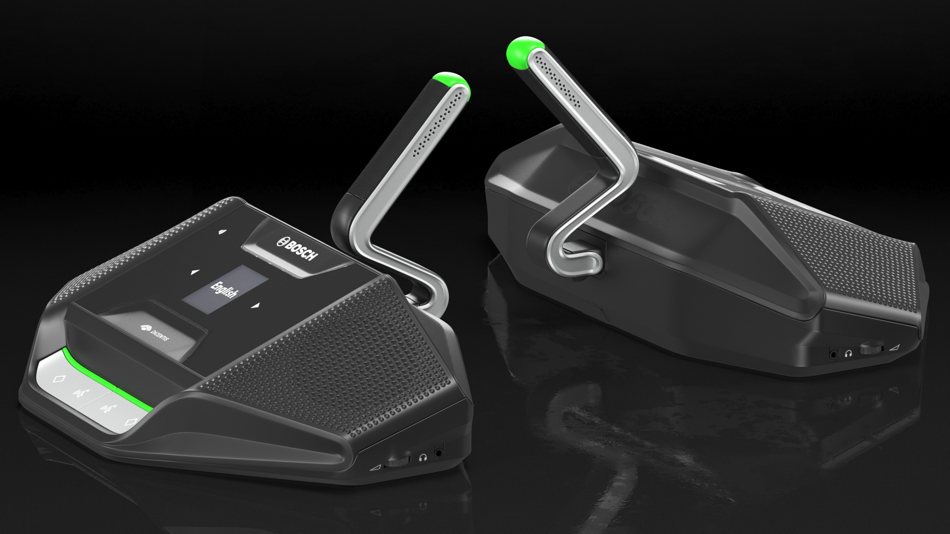 Bosch Discussion Device with Language Selector, touchscreen, directive microphone, voting feature, and speaker a part of electronic discussion system.