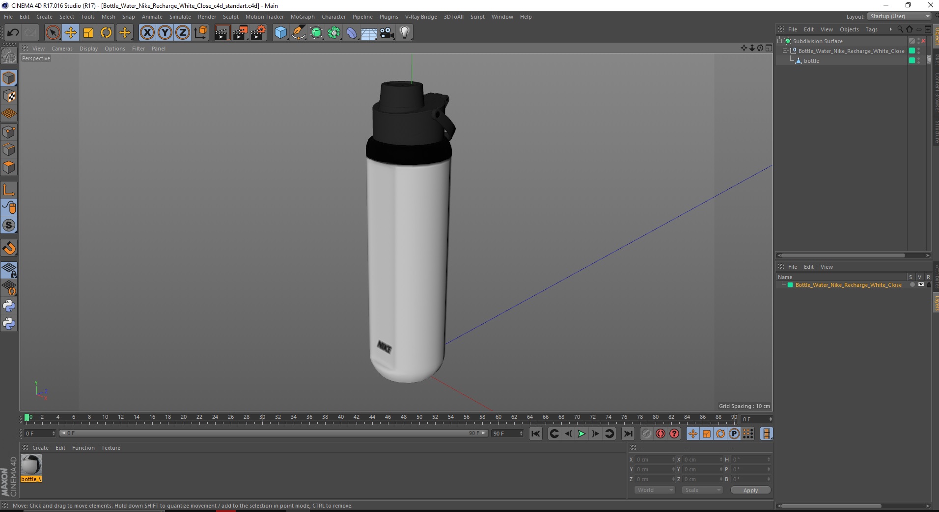 Bottle Water Nike Recharge White Close is a high quality, photo real 3d model that will enhance detail and realism to any of your rendering projects. The model has a fully textured, detailed design that allows for close-up renders, and was originally modeled in 3ds Max 2020 and rendered with V-Ray. Renders have no postprocessing!