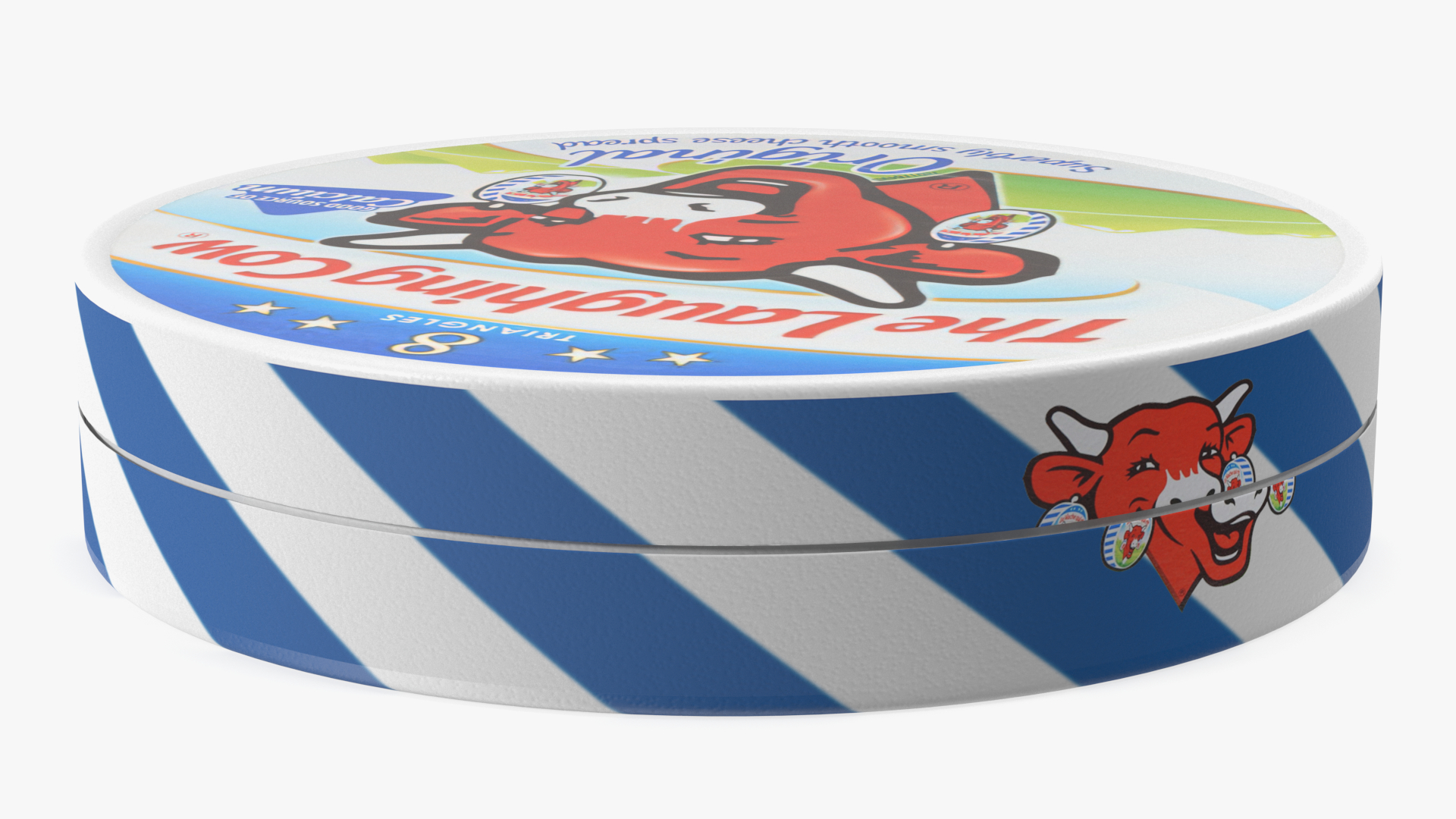 Box of Laughing Cow Original Creamy Cheese is a three-dimensional model of round paper container with set of pieces of processed cheese specimens (cheese spread items) which are triangle packages with well known aluminum foil wrapping.