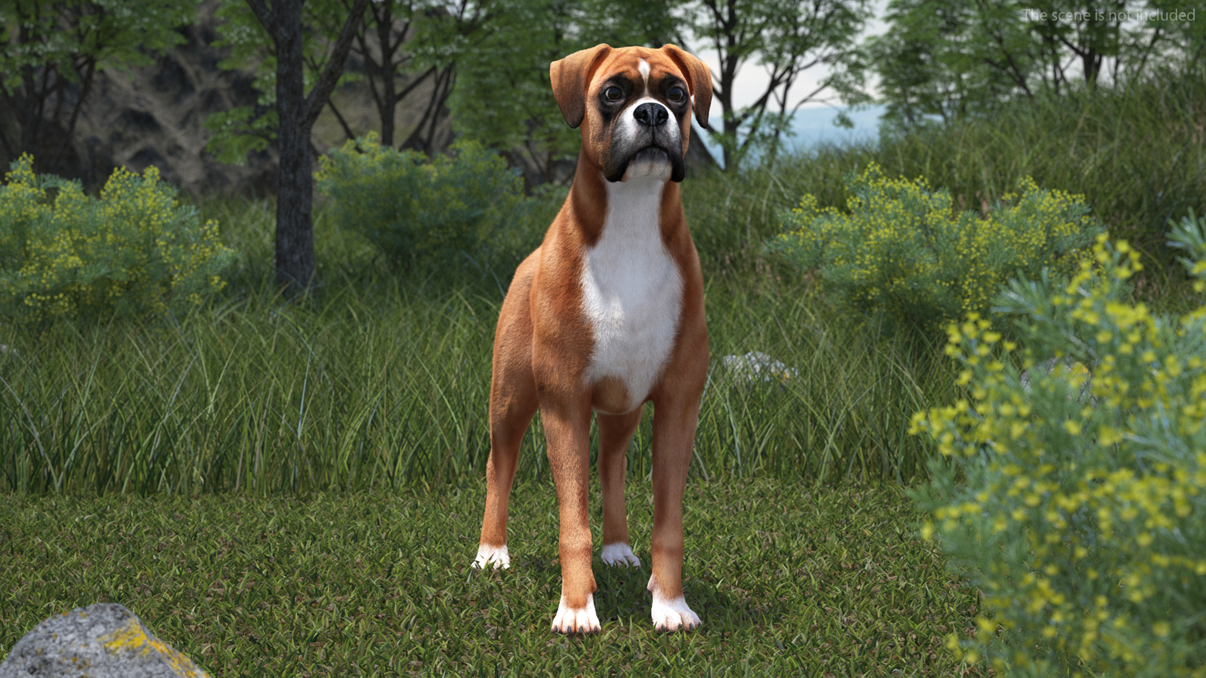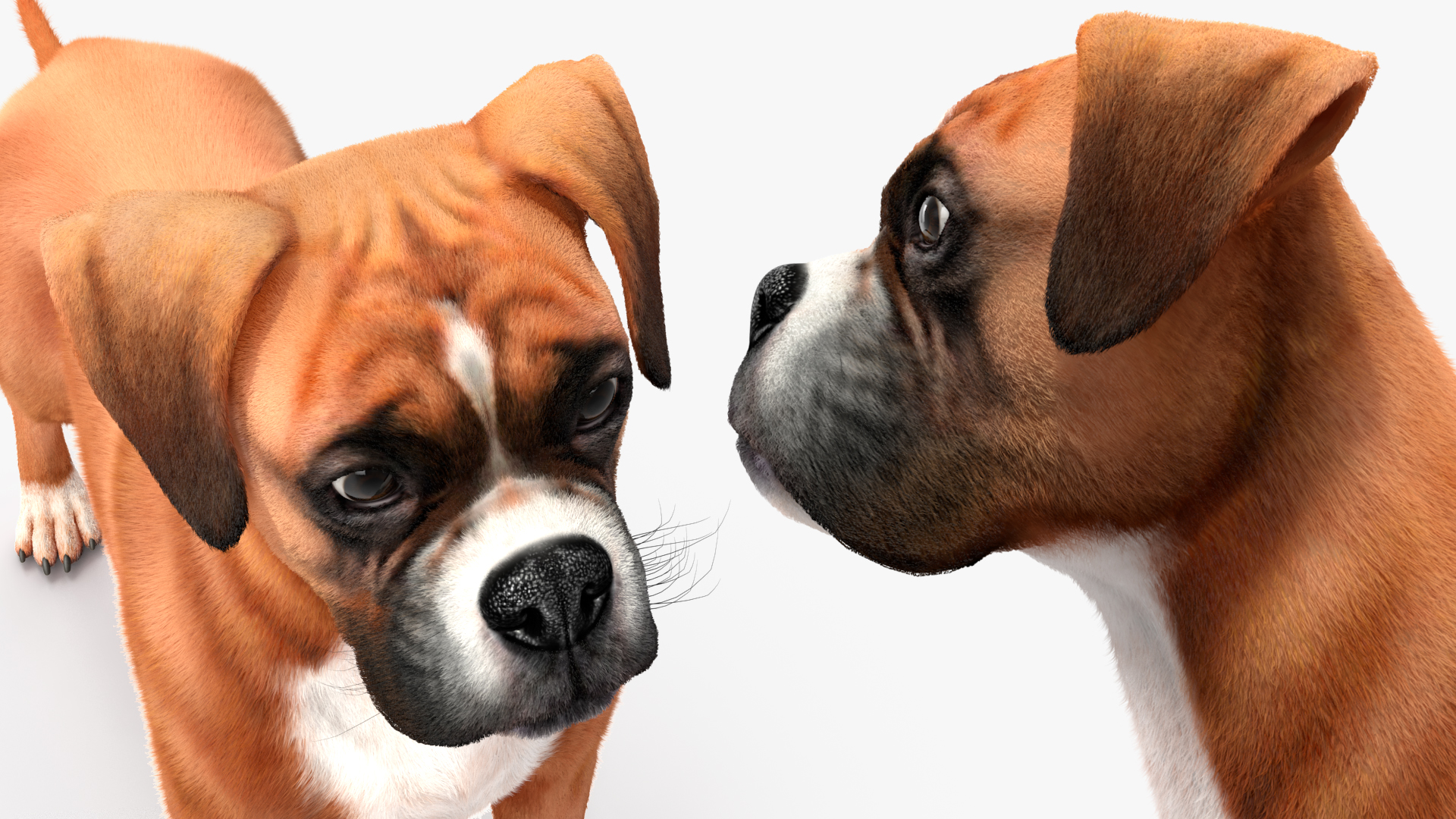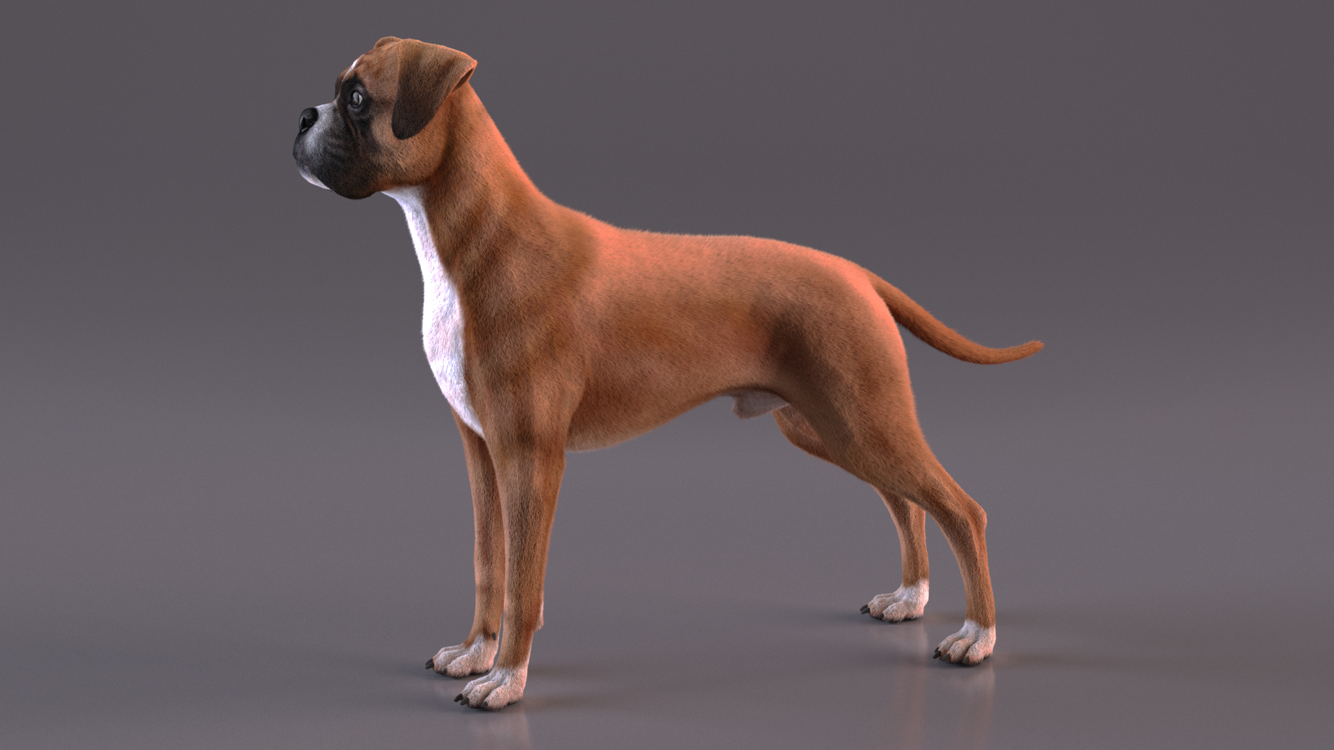 Boxer Dog Fur is a three-dimensional model of boxer bred dog animal, that is a medium-sized breed of domestic dog known for its muscular build, short coat, and distinctive face.