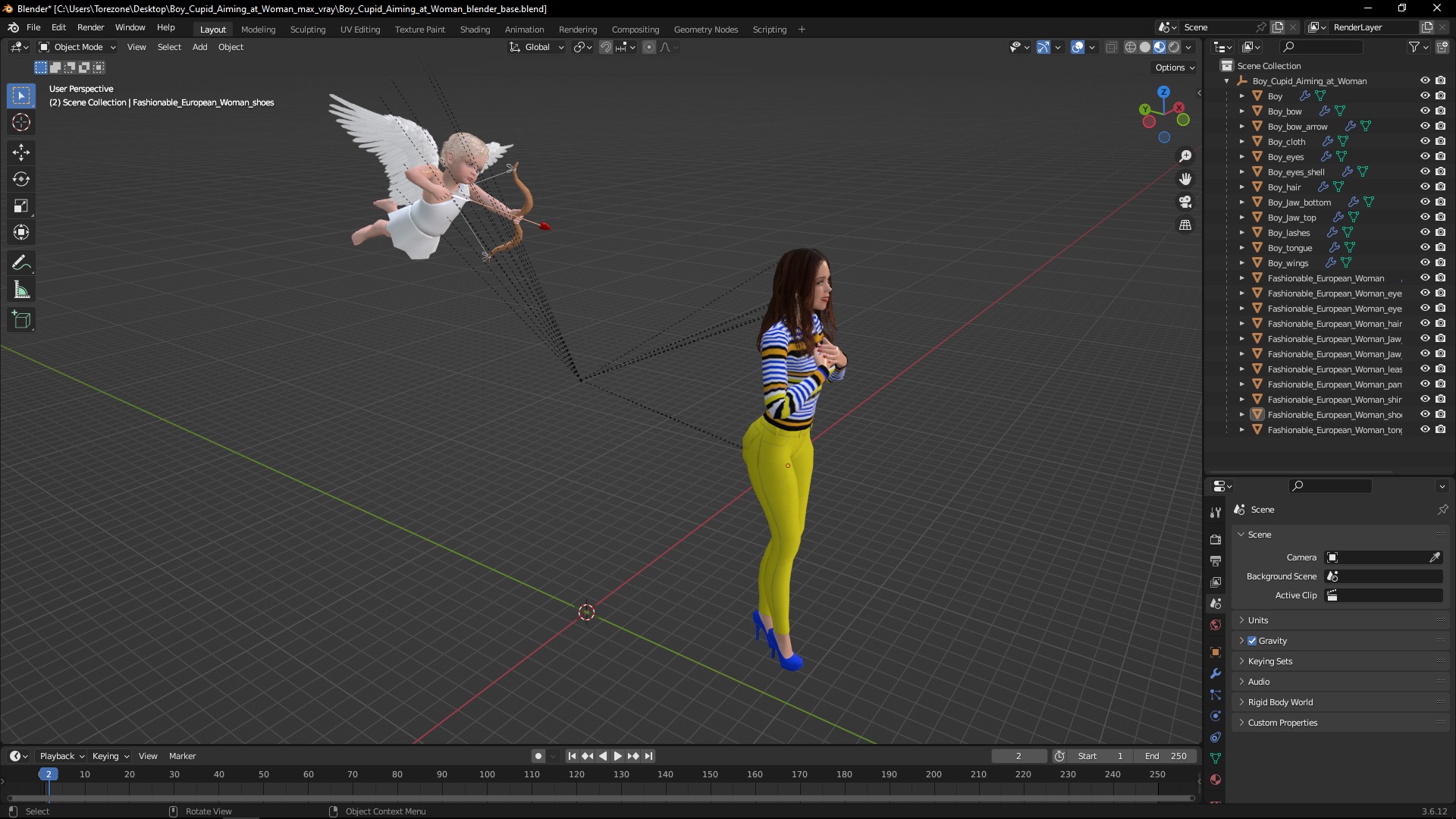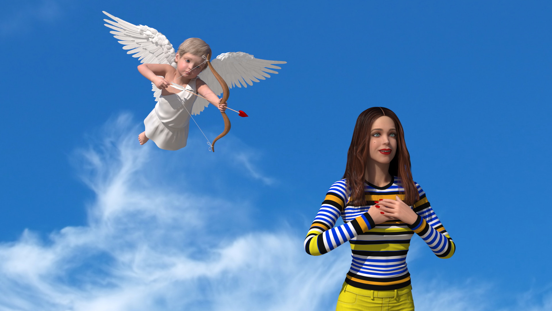 Boy Cupid Aiming at Woman is a three-dimensional model of Cupid Boy (cherub, amur or amour) and the beautiful woman characters.