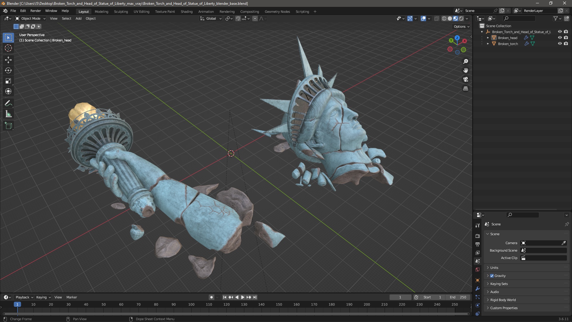Broken Torch and Head of Statue of Liberty is a high quality, photo real 3d model that will enhance detail and realism to any of your rendering projects. The model has a fully textured, detailed design that allows for close-up renders, and was originally modeled in 3ds Max 2020 and rendered with V-Ray. Renders have no postprocessing!
