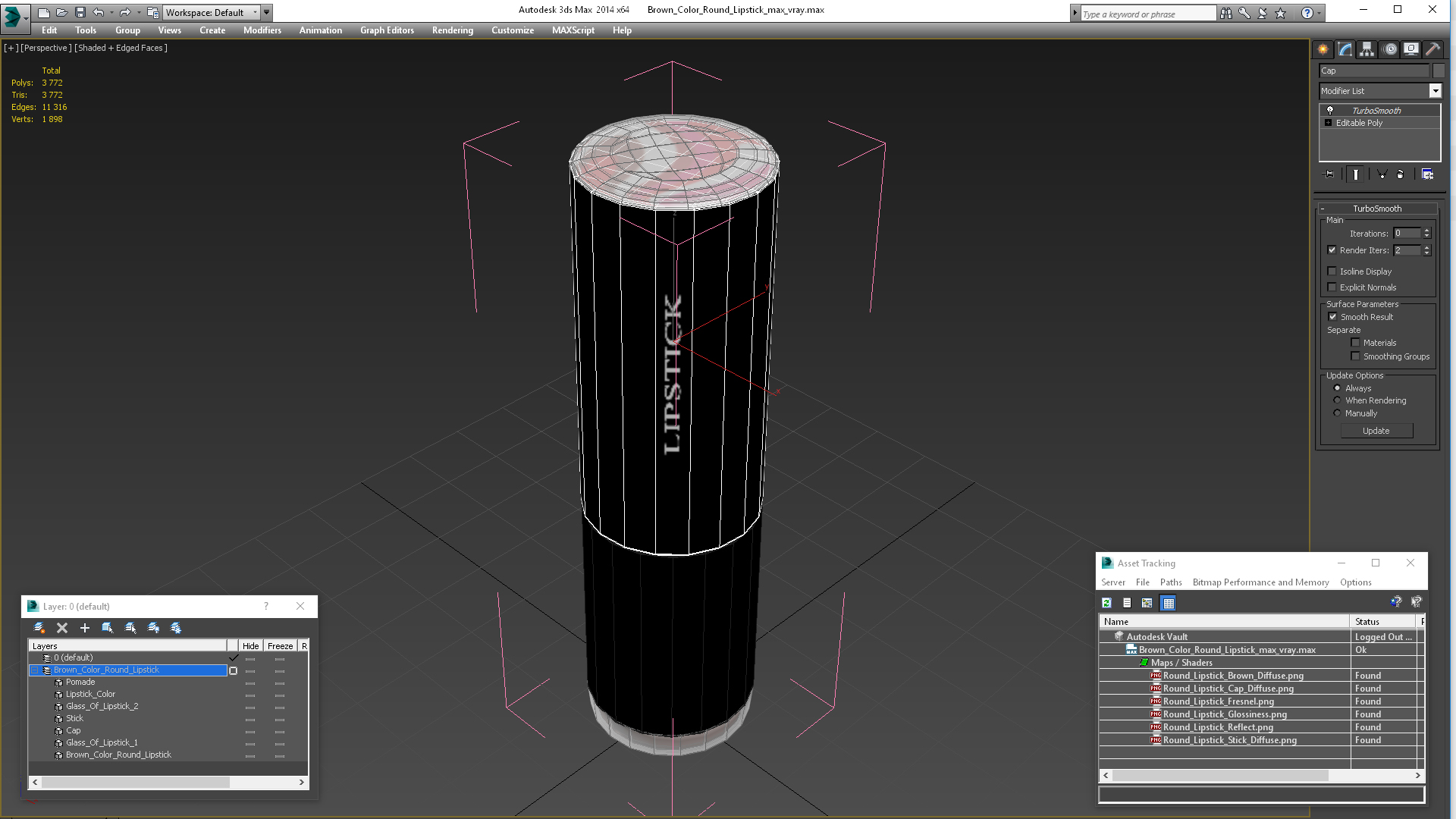 Brown Color Round Lipstick is a high quality, photo real 3d model that will enhance detail and realism to any of your rendering projects. The model has a fully textured, detailed design that allows for close-up renders, and was originally modeled in 3ds Max 2020 and rendered with V-Ray. Renders have no postprocessing!