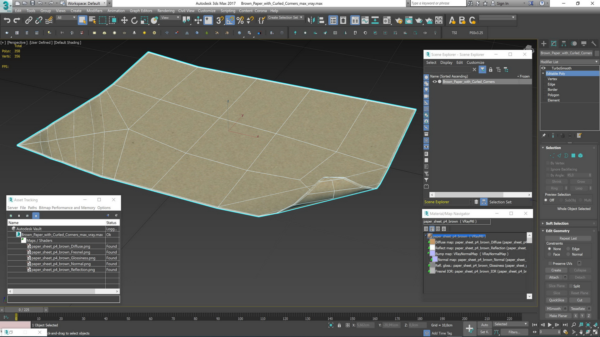 Brown Paper with Curled Corners is a high quality, photo real 3d model that will enhance detail and realism to any of your rendering projects. The model has a fully textured, detailed design that allows for close-up renders, and was originally modeled in 3ds Max 2020 and rendered with V-Ray. Renders have no postprocessing!