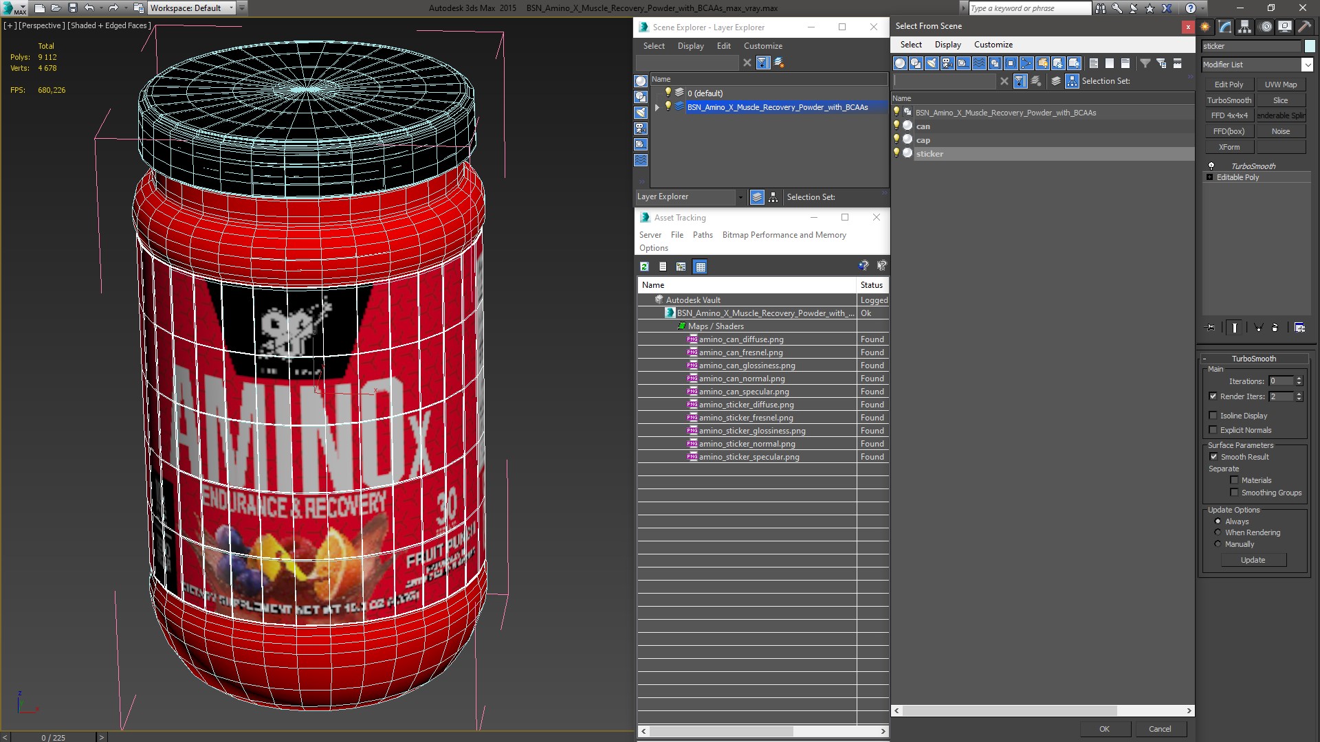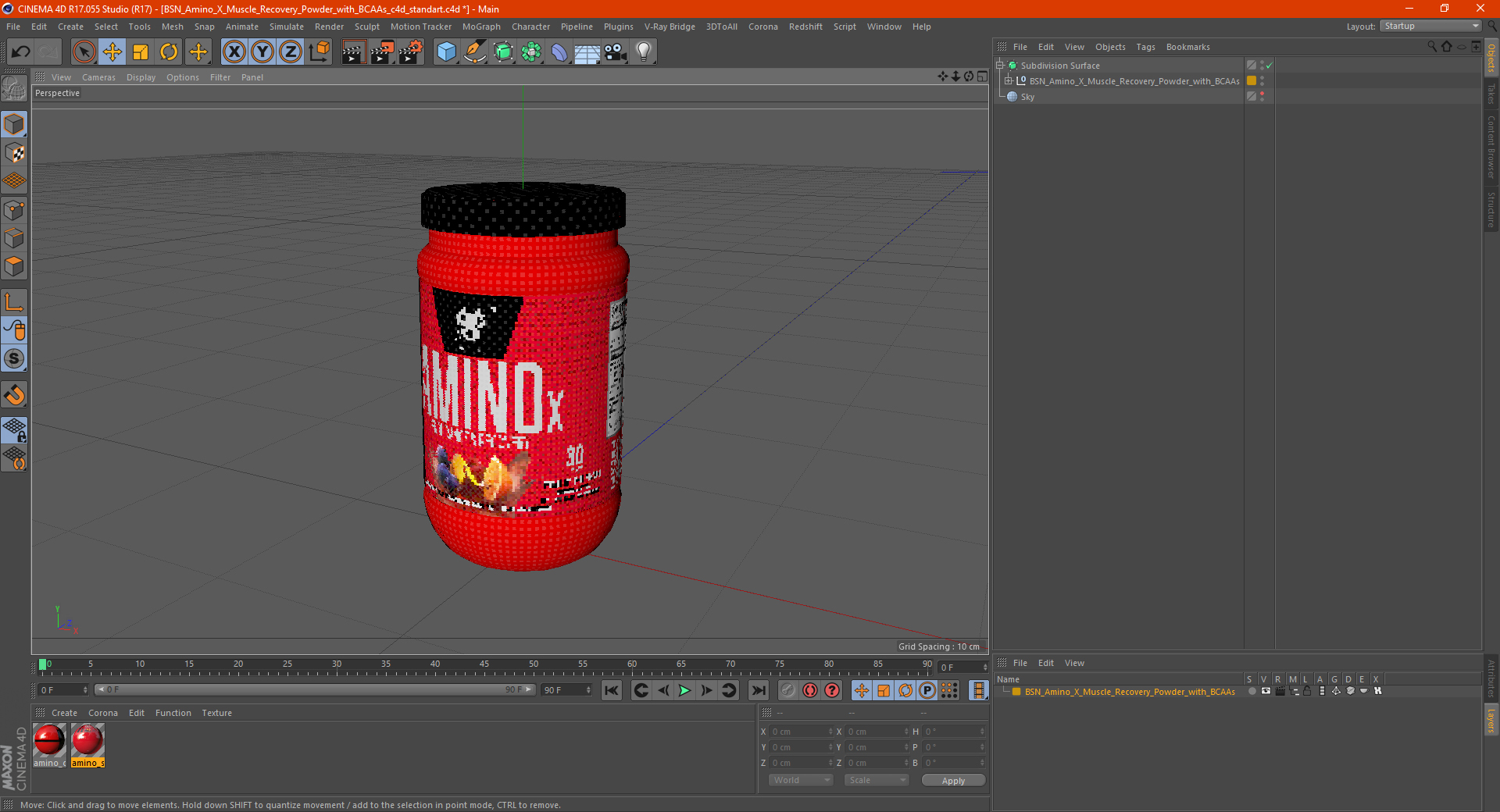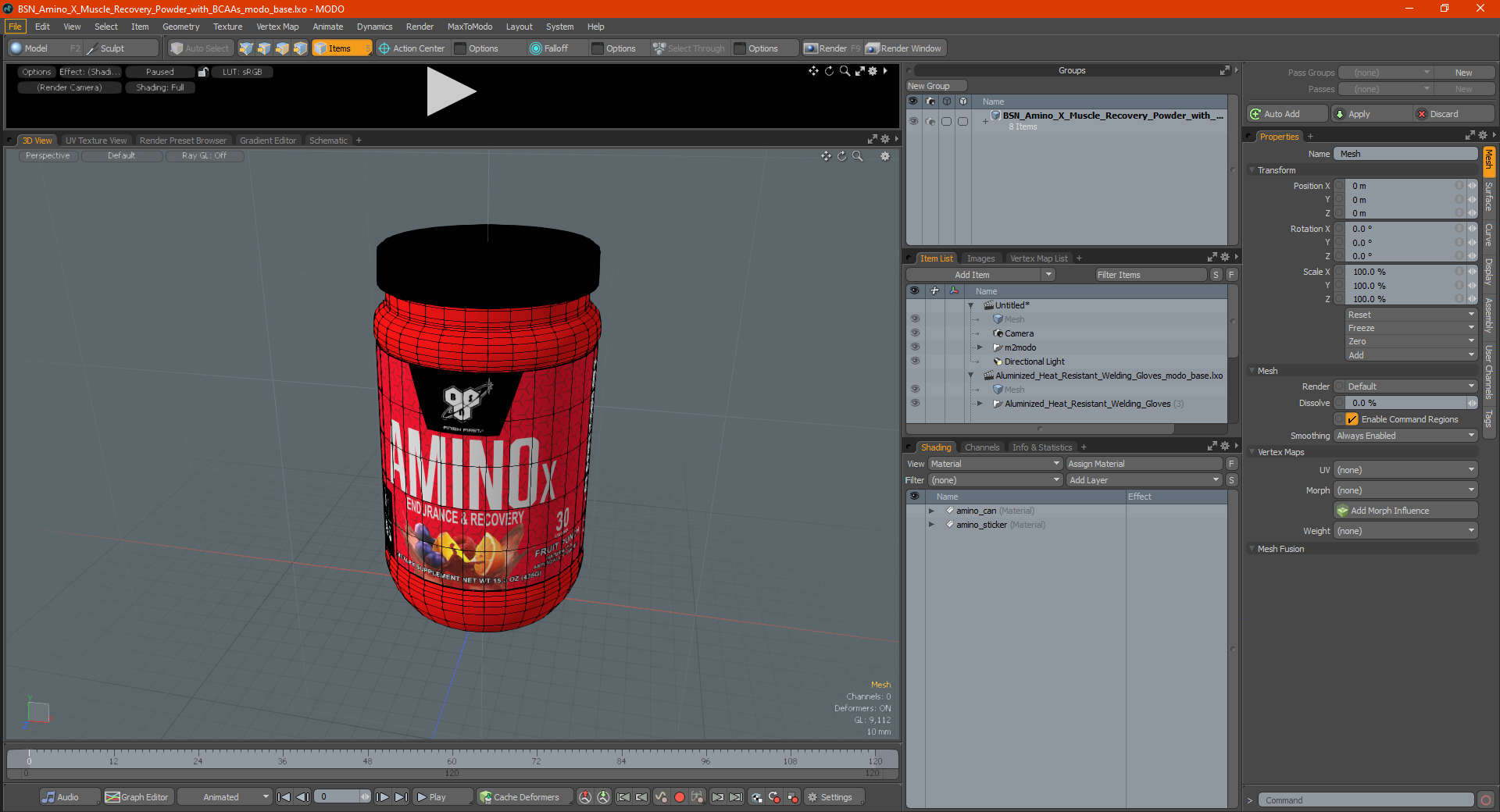 BSN Amino X Muscle Recovery Powder with BCAAs is a high quality, photo real 3d model that will enhance detail and realism to any of your rendering projects. The model has a fully textured, detailed design that allows for close-up renders, and was originally modeled in 3ds Max 2020 and rendered with V-Ray. Renders have no postprocessing!