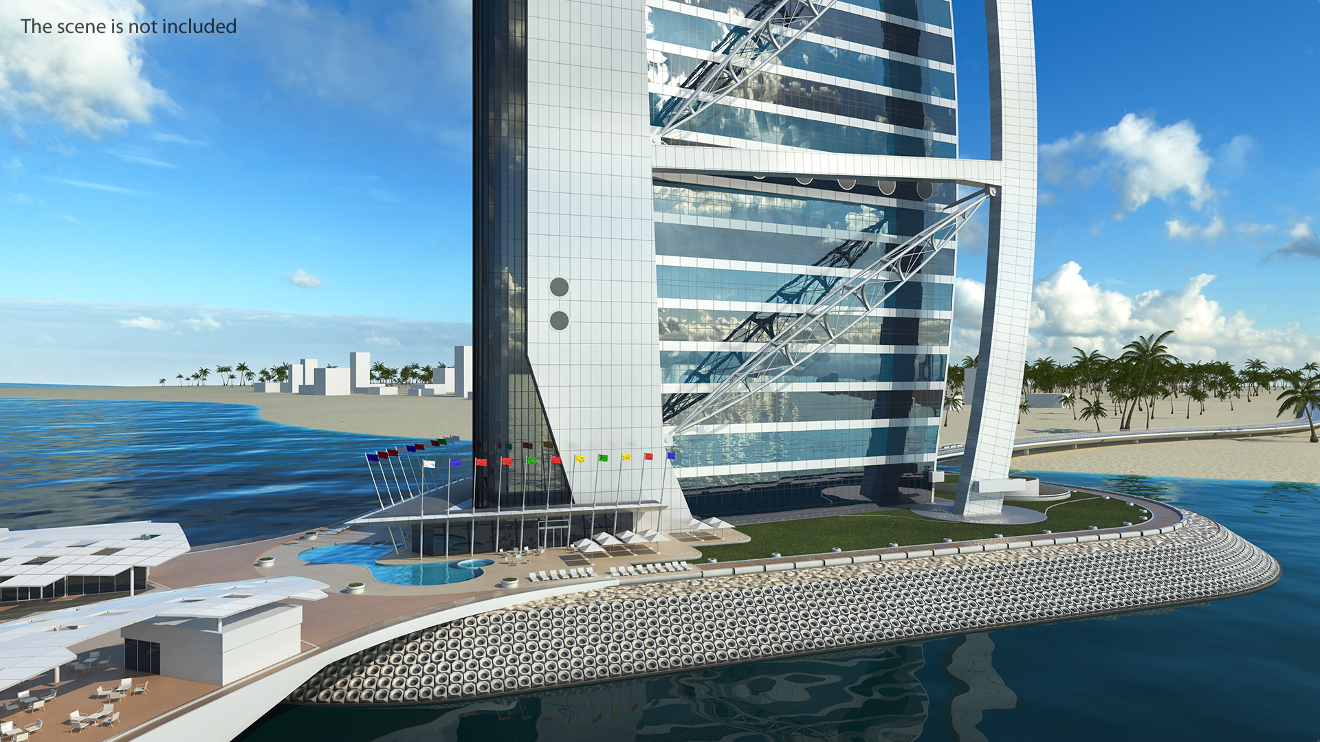 Burj Al Arab Tower is a high quality, photo real 3d model that will enhance detail and realism to any of your rendering projects. The model has a fully textured, detailed design that allows for close-up renders, and was originally modeled in 3ds Max 2020 and rendered with V-Ray. Renders have no postprocessing!
