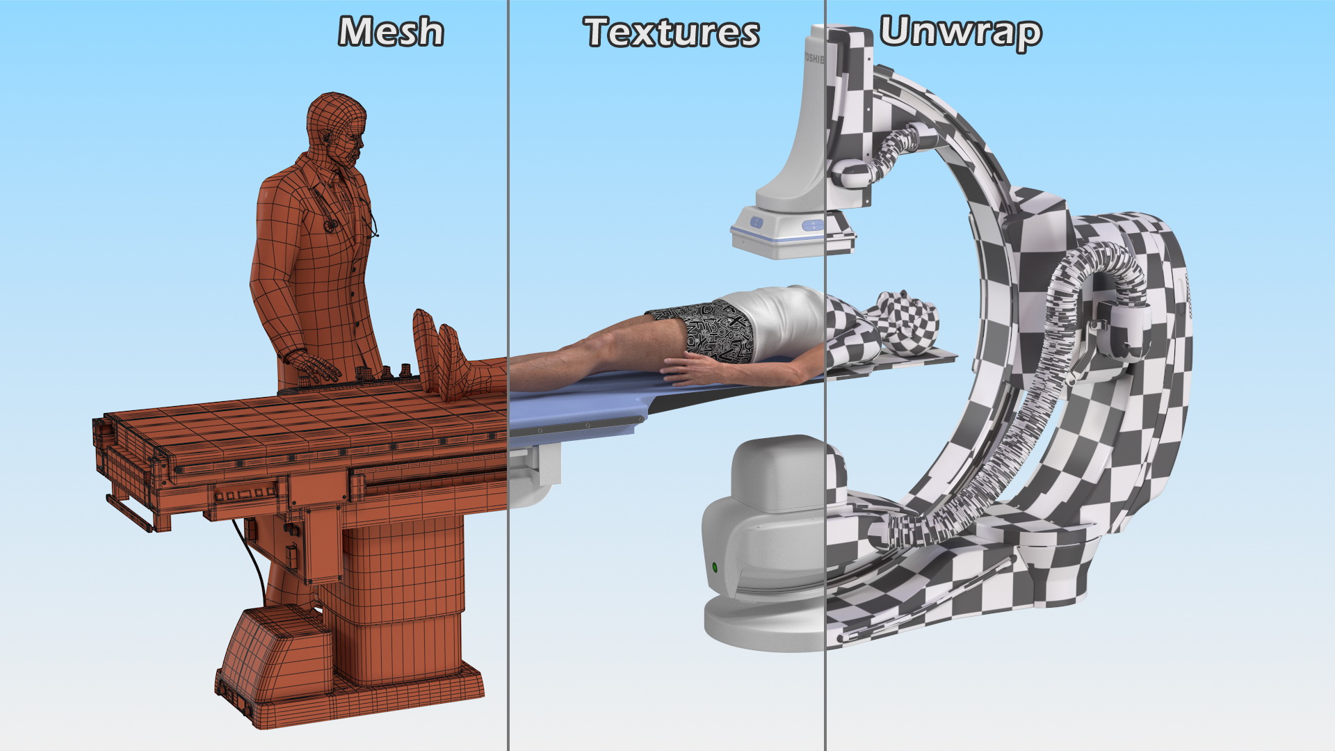 C Arm System with Patient and Doctor Rigged is a high quality, photo real 3d model that will enhance detail and realism to any of your rendering projects. The model has a fully textured, detailed design that allows for close-up renders, and was originally modeled in 3ds Max 2020 and rendered with V-Ray. Renders have no postprocessing!