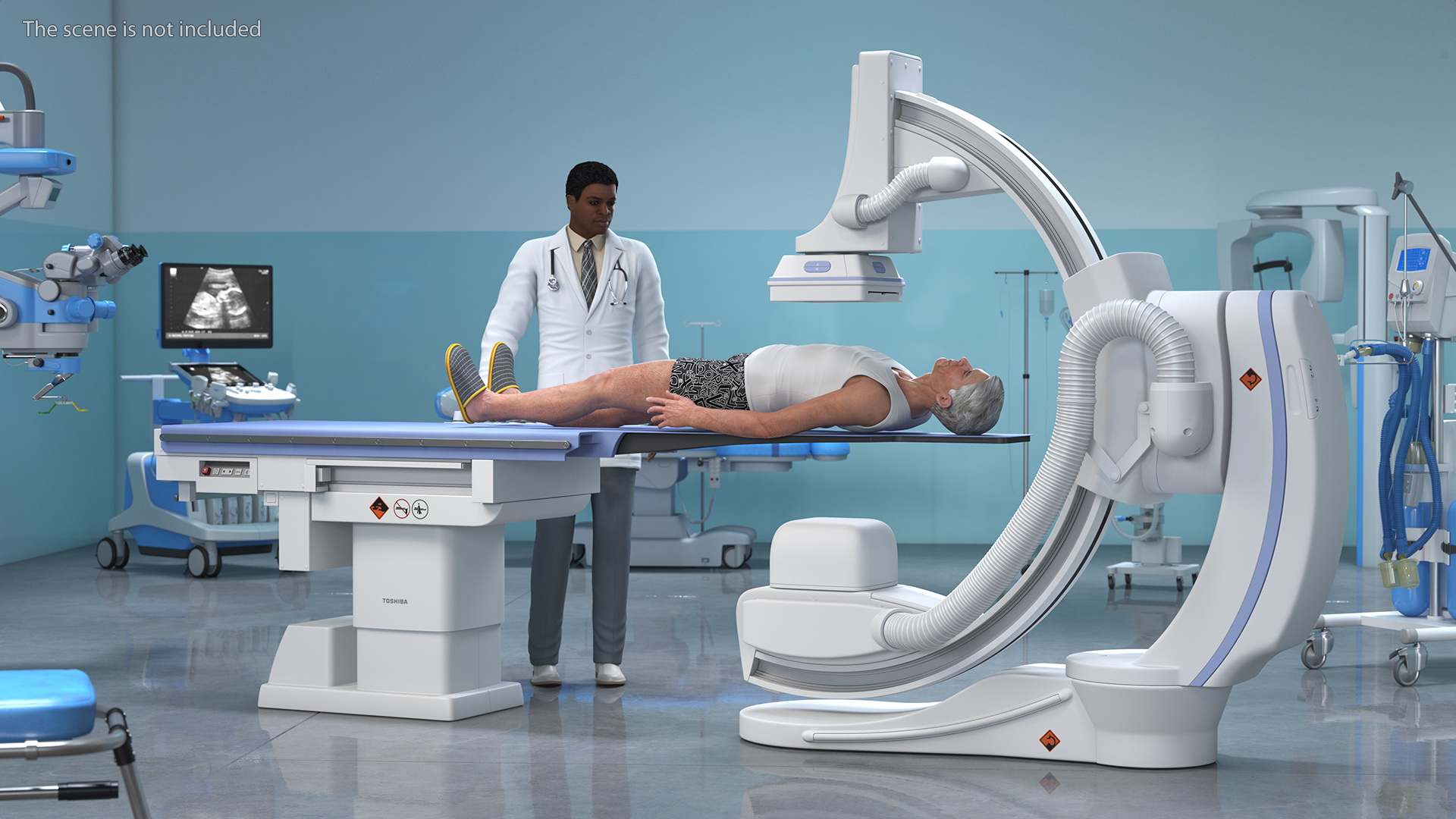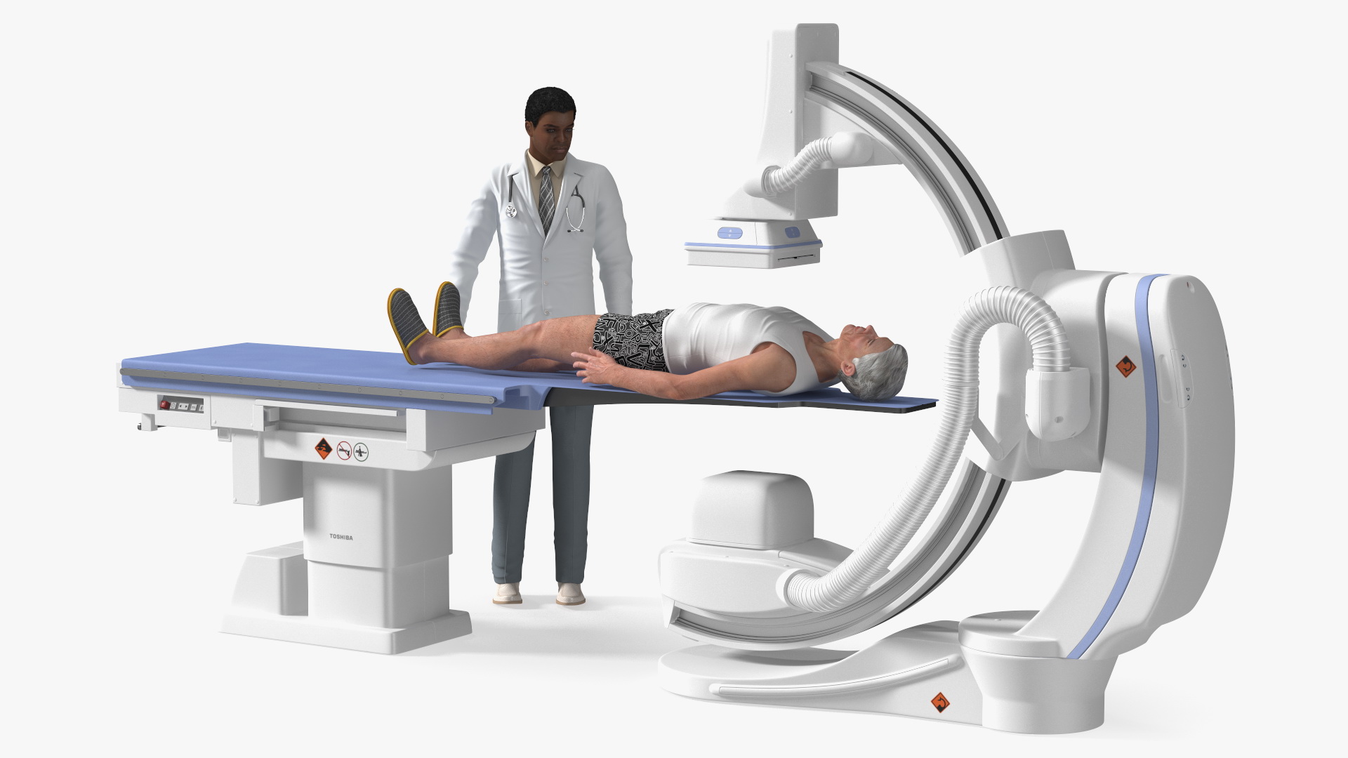 C Arm System with Patient and Doctor Rigged is a three-dimensional model of an African-American medical physician, elderly male person and modern C-Arm system diagnostic equipment.