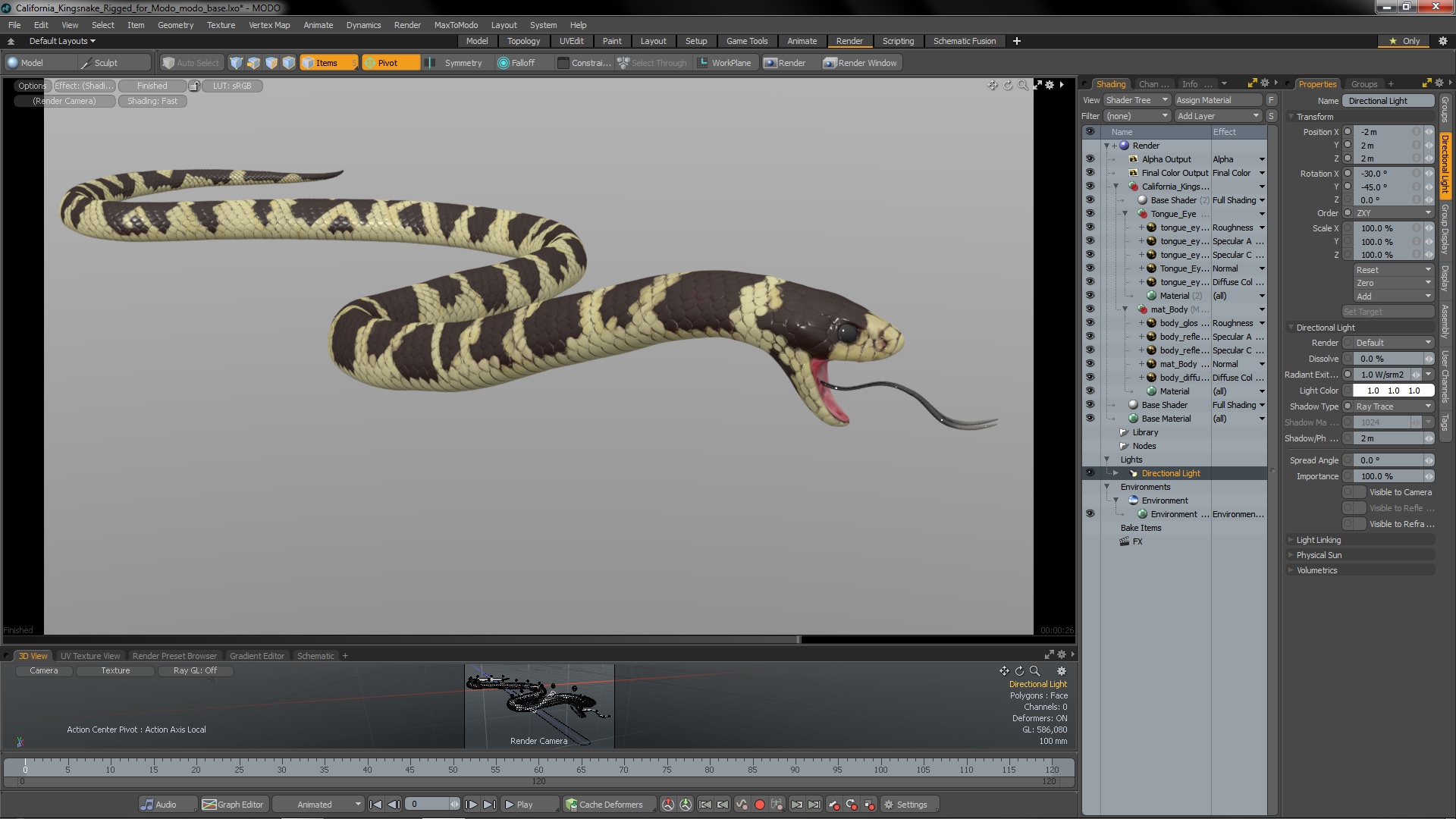 California Kingsnake Rigged for Modo is a high quality, photo real 3d model that will enhance detail and realism to any of your rendering projects. The model has a fully textured, detailed design that allows for close-up renders, and was originally modeled in 3ds Max 2020 and rendered with V-Ray. Renders have no postprocessing!
