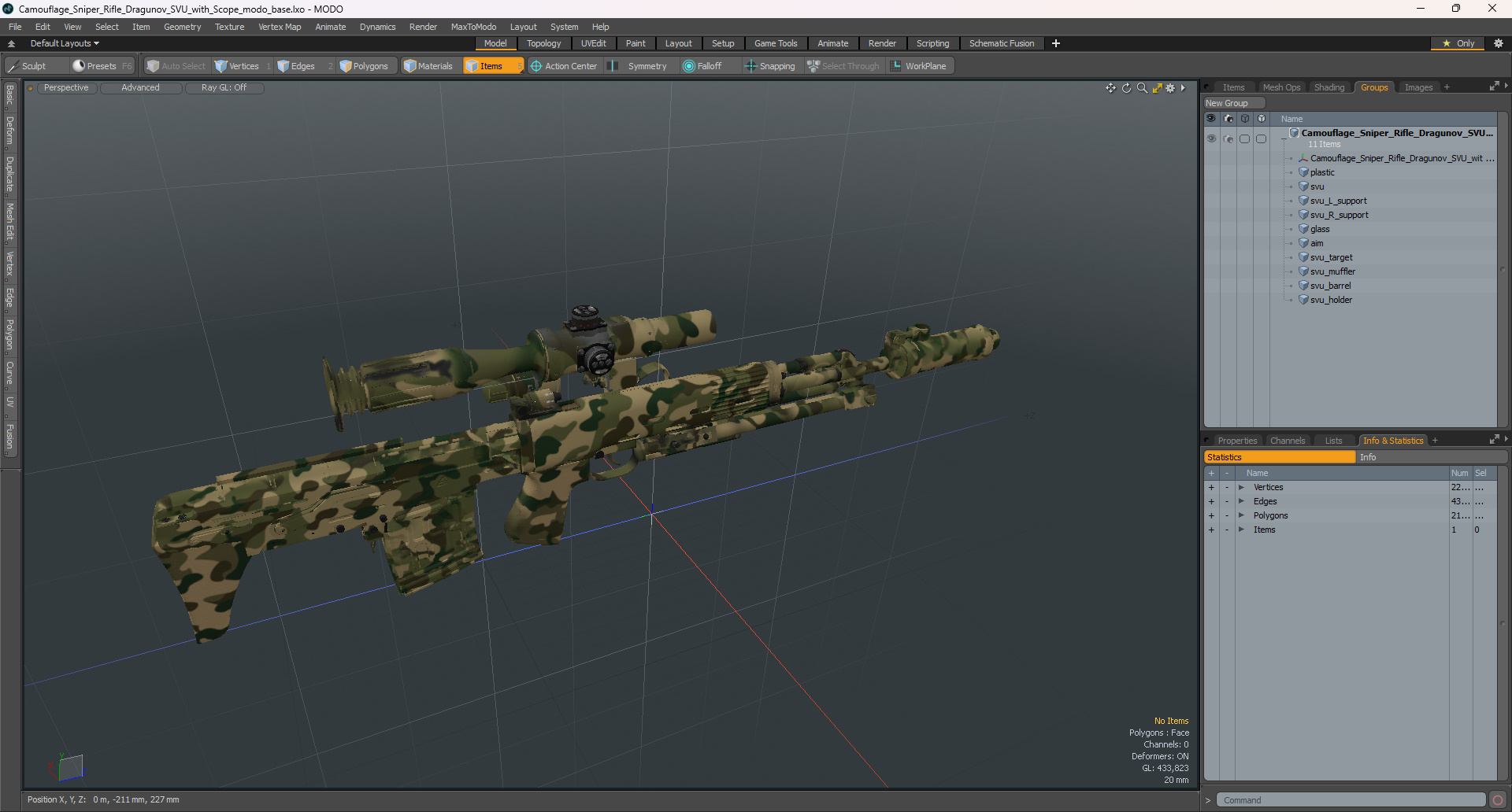 Camouflage Sniper Rifle Dragunov SVU with Scope is a high quality, photo real 3d model that will enhance detail and realism to any of your rendering projects. The model has a fully textured, detailed design that allows for close-up renders, and was originally modeled in 3ds Max 2020 and rendered with V-Ray. Renders have no postprocessing!