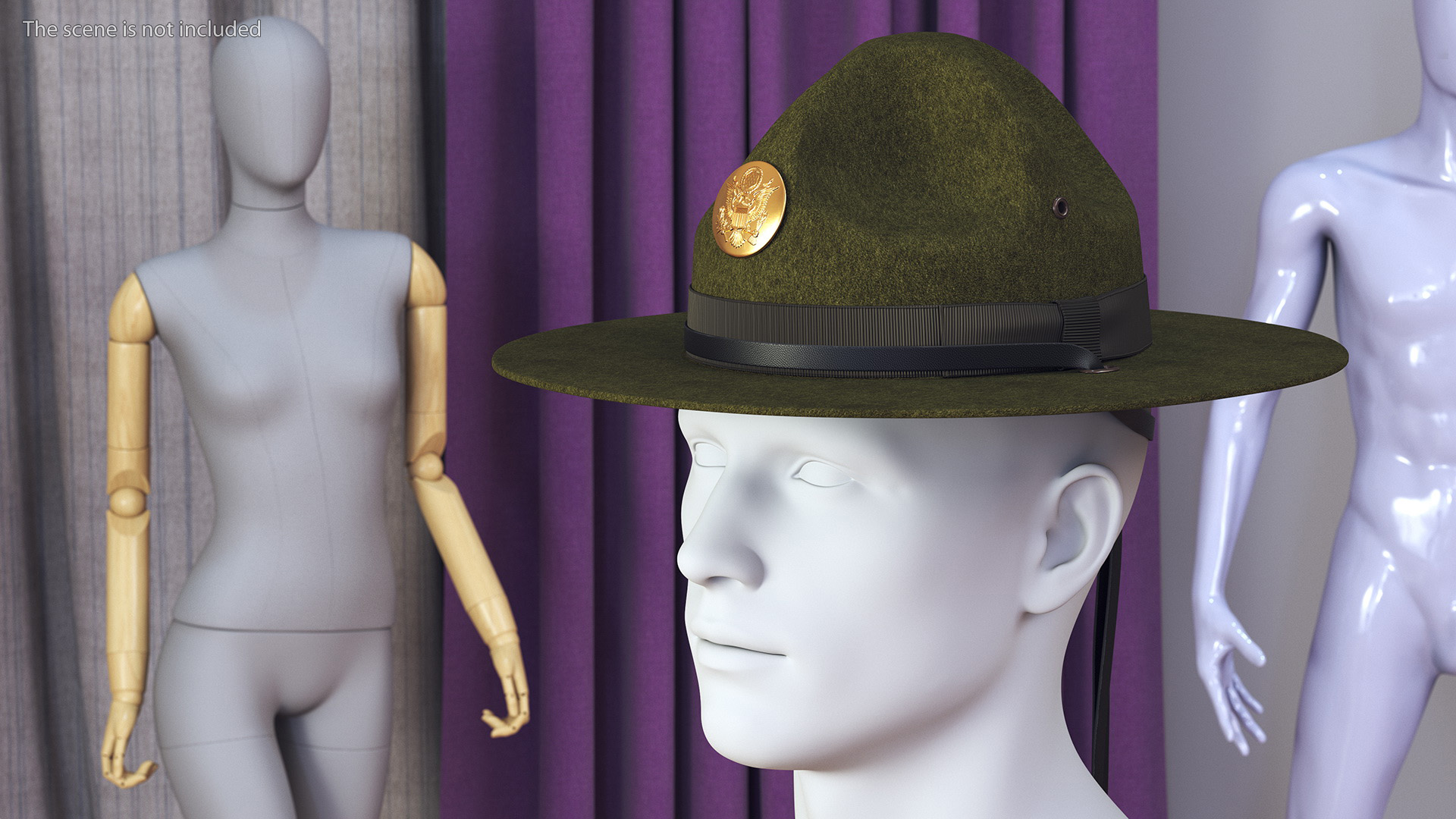 Campaign Hat with Cockade Green on Mannequin is a 3d model of type of wide-brimmed hat worn by drill sergeants in the United States Army.