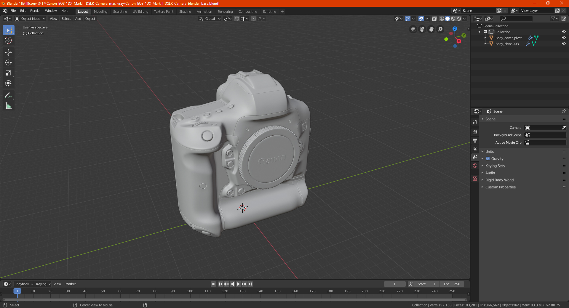 Canon EOS 1DX MarkIII DSLR Camera is a high quality, photo real 3d model that will enhance detail and realism to any of your rendering projects. The model has a fully textured, detailed design that allows for close-up renders, and was originally modeled in 3ds Max 2020 and rendered with V-Ray. Renders have no postprocessing!
