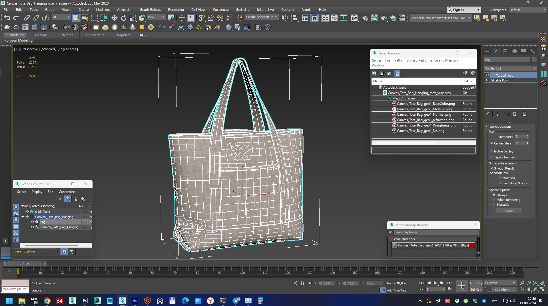 Canvas Tote Bag Hanging is a high quality, photo real 3d model that will enhance detail and realism to any of your rendering projects. The model has a fully textured, detailed design that allows for close-up renders, and was originally modeled in 3ds Max 2020 and rendered with V-Ray. Renders have no postprocessing!