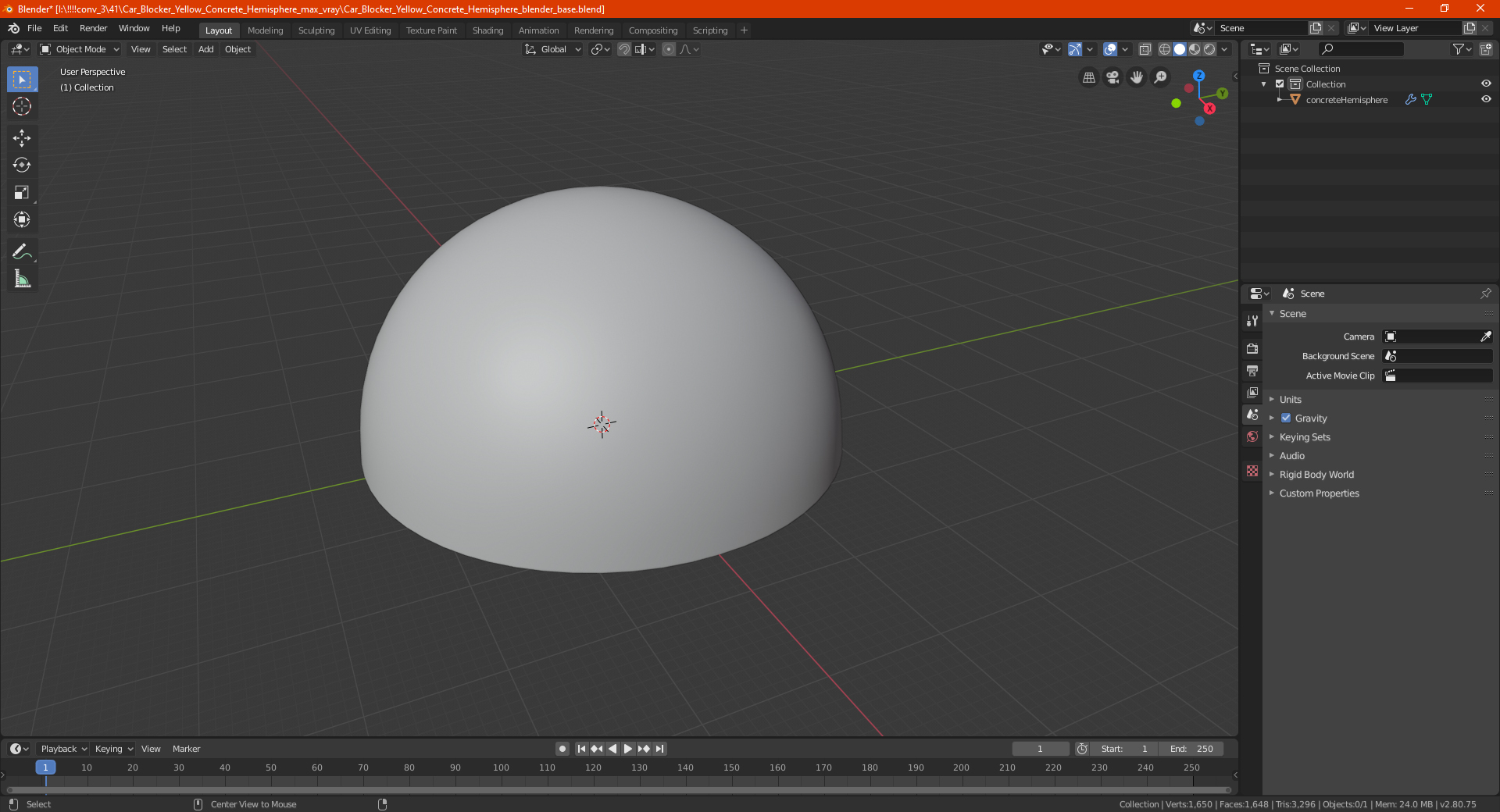 Car Blocker Yellow Concrete Hemisphere is a high quality, photo real 3d model that will enhance detail and realism to any of your rendering projects. The model has a fully textured, detailed design that allows for close-up renders, and was originally modeled in 3ds Max 2020 and rendered with V-Ray. Renders have no postprocessing!