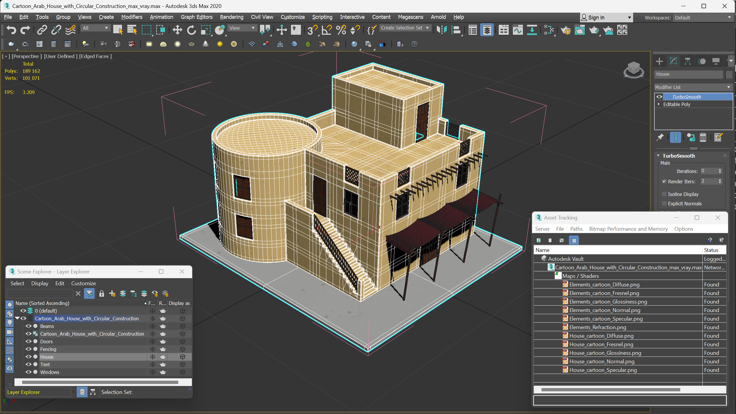 Cartoon Arab House with Circular Construction is a high quality, photo real 3d model that will enhance detail and realism to any of your rendering projects. The model has a fully textured, detailed design that allows for close-up renders, and was originally modeled in 3ds Max 2020 and rendered with V-Ray. Renders have no postprocessing!