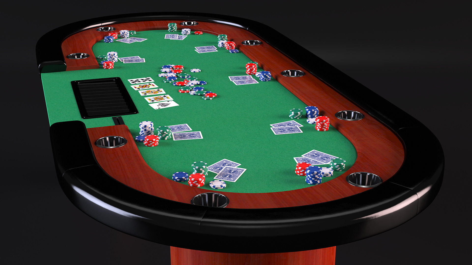Casino Poker Table with Cards and Chips is a high quality, photo real 3d model that will enhance detail and realism to any of your rendering projects. The model has a fully textured, detailed design that allows for close-up renders, and was originally modeled in 3ds Max 2020 and rendered with V-Ray. Renders have no postprocessing!