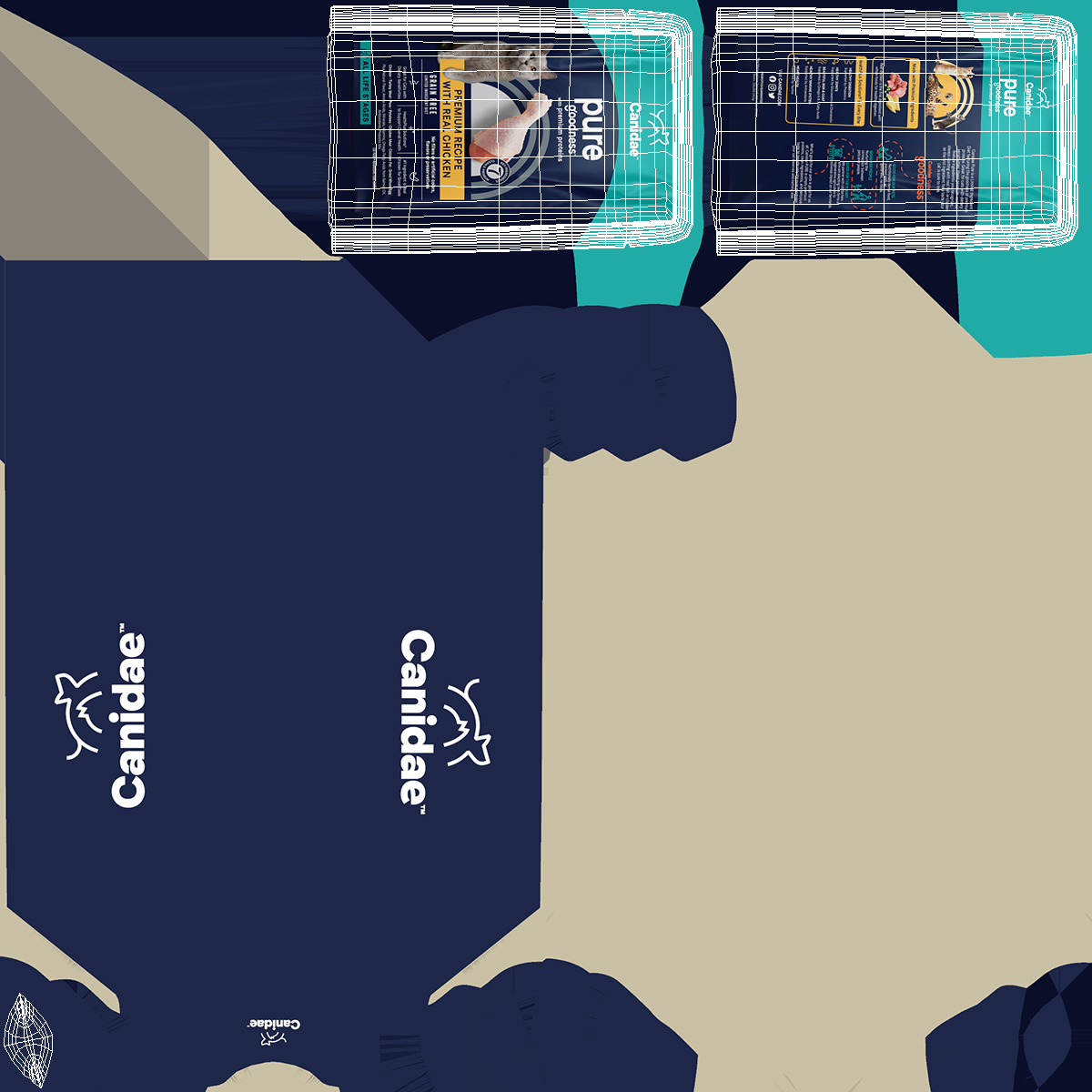 Cat Food Pouch Canidae is a 3D model of wet pet food, which is a popular, widespread and well known option for providing nutrition to cats (home feline animals).