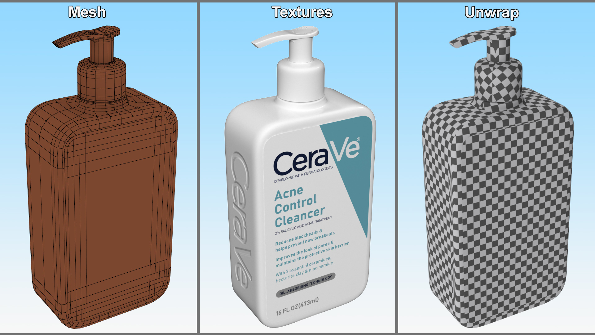 CeraVe Cleanser Dispenser Bottle 473 ml Aquamarine is a high quality, photo real 3d model that will enhance detail and realism to any of your rendering projects. The model has a fully textured, detailed design that allows for close-up renders, and was originally modeled in 3ds Max 2020 and rendered with V-Ray. Renders have no postprocessing!
