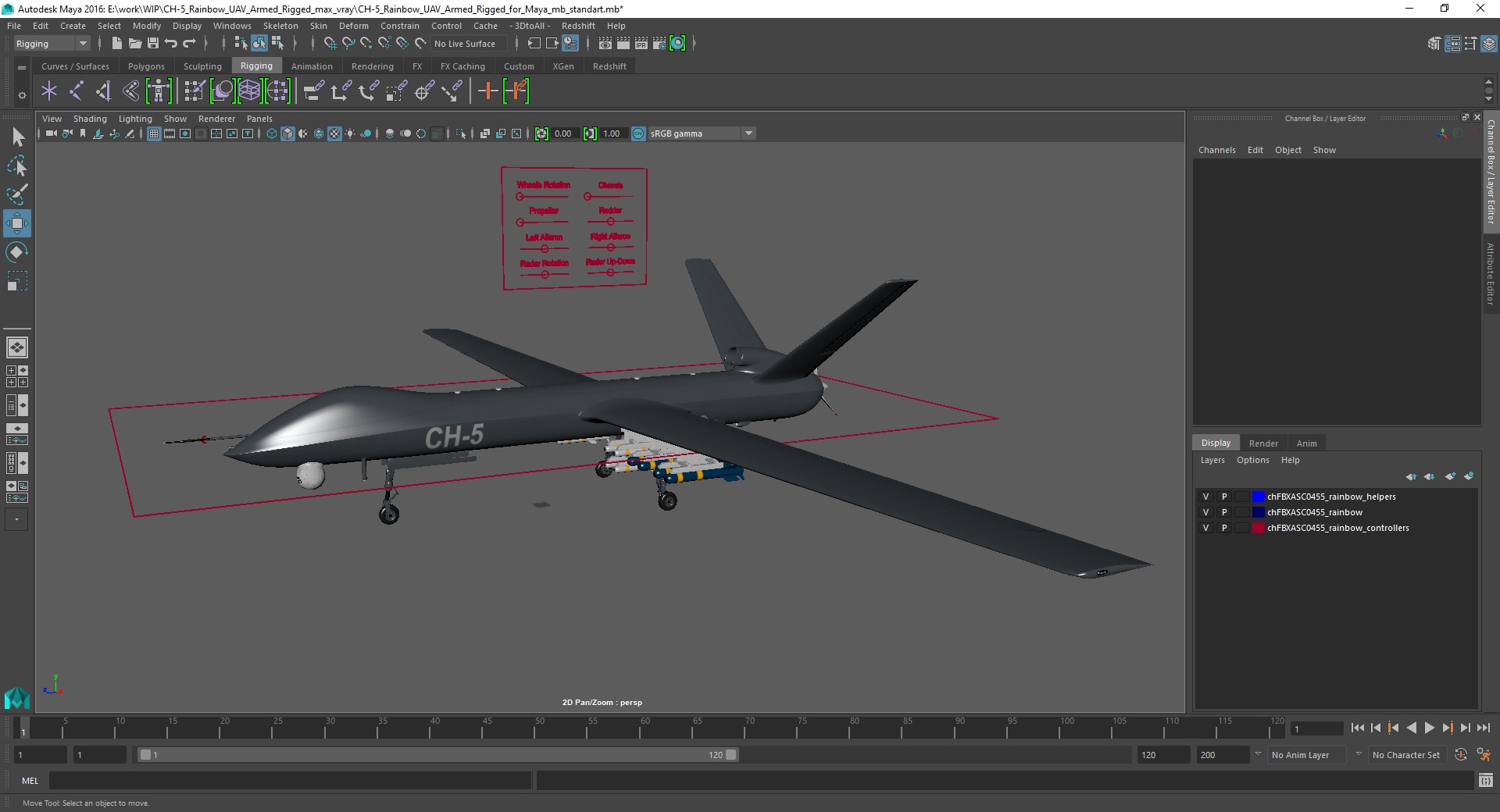CH-5 Rainbow UAV Armed Rigged for Maya is fully rigged and is ready to be animated in Maya. You can easily position it the way you need or animate it the way your project requires. See the screenshots to get an idea of how rigging works. The pose of the model on the render images is an example and can be recreated using rig, it is not initially included into the product.