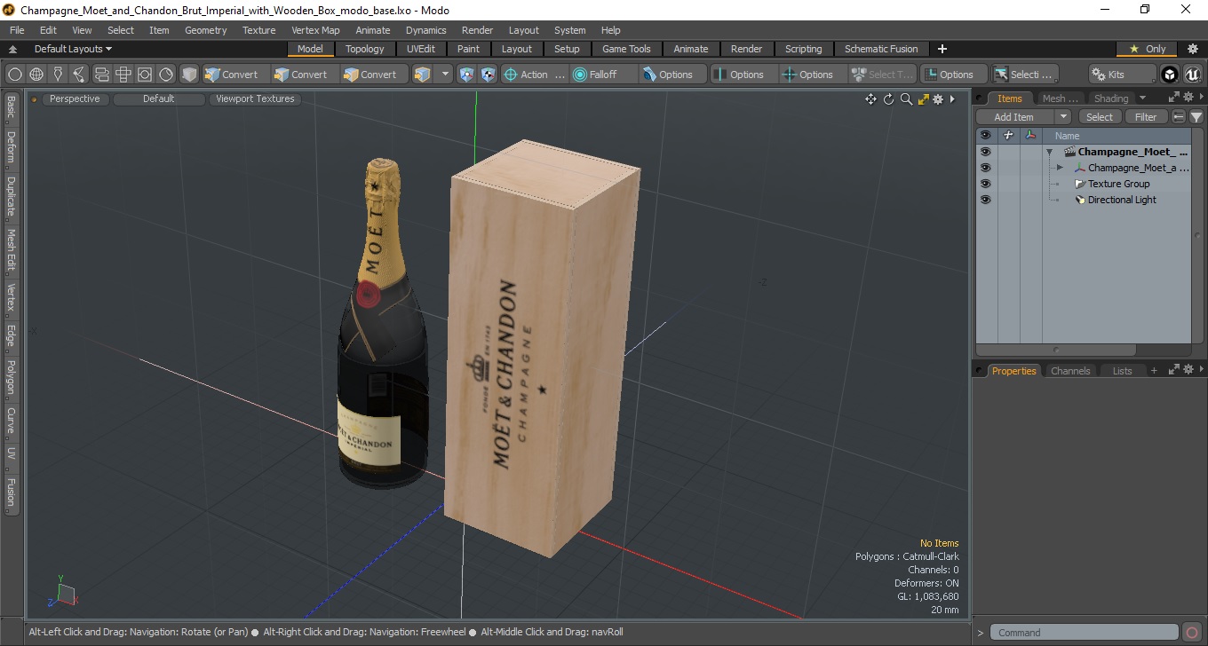Champagne Moet and Chandon Brut Imperial with Wooden Box is a high quality, photo real 3d model that will enhance detail and realism to any of your rendering projects. The model has a fully textured, detailed design that allows for close-up renders, and was originally modeled in 3ds Max 2020 and rendered with V-Ray. Renders have no postprocessing!