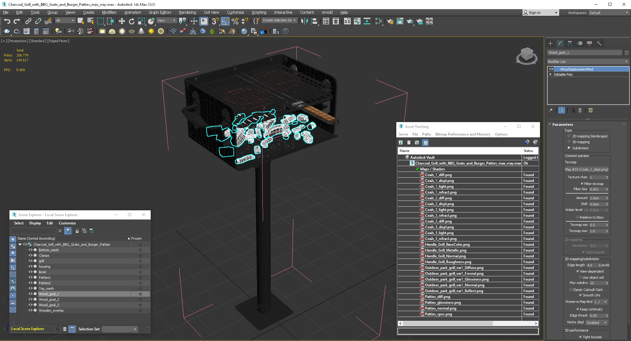 Charcoal Grill with BBQ Grate and Burger Patties is a high quality, photo real 3d model that will enhance detail and realism to any of your rendering projects. The model has a fully textured, detailed design that allows for close-up renders, and was originally modeled in 3ds Max 2020 and rendered with V-Ray. Renders have no postprocessing!